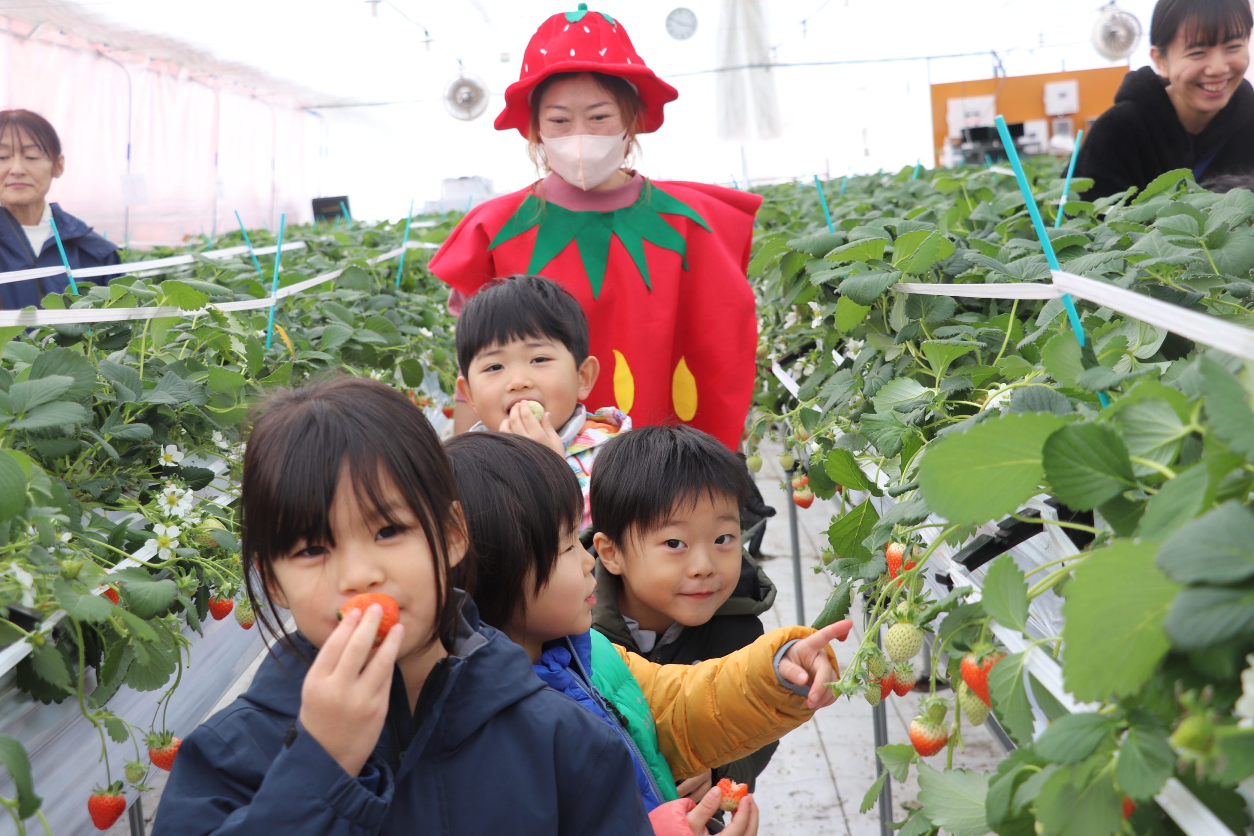 イチゴの服を着たスタッフもおり、園児たちは、スタッフに話しかけながら楽しそうにイチゴを手に取り、「おいしい」「たくさん食べたね」など笑顔でイチゴ狩りを満喫していた。