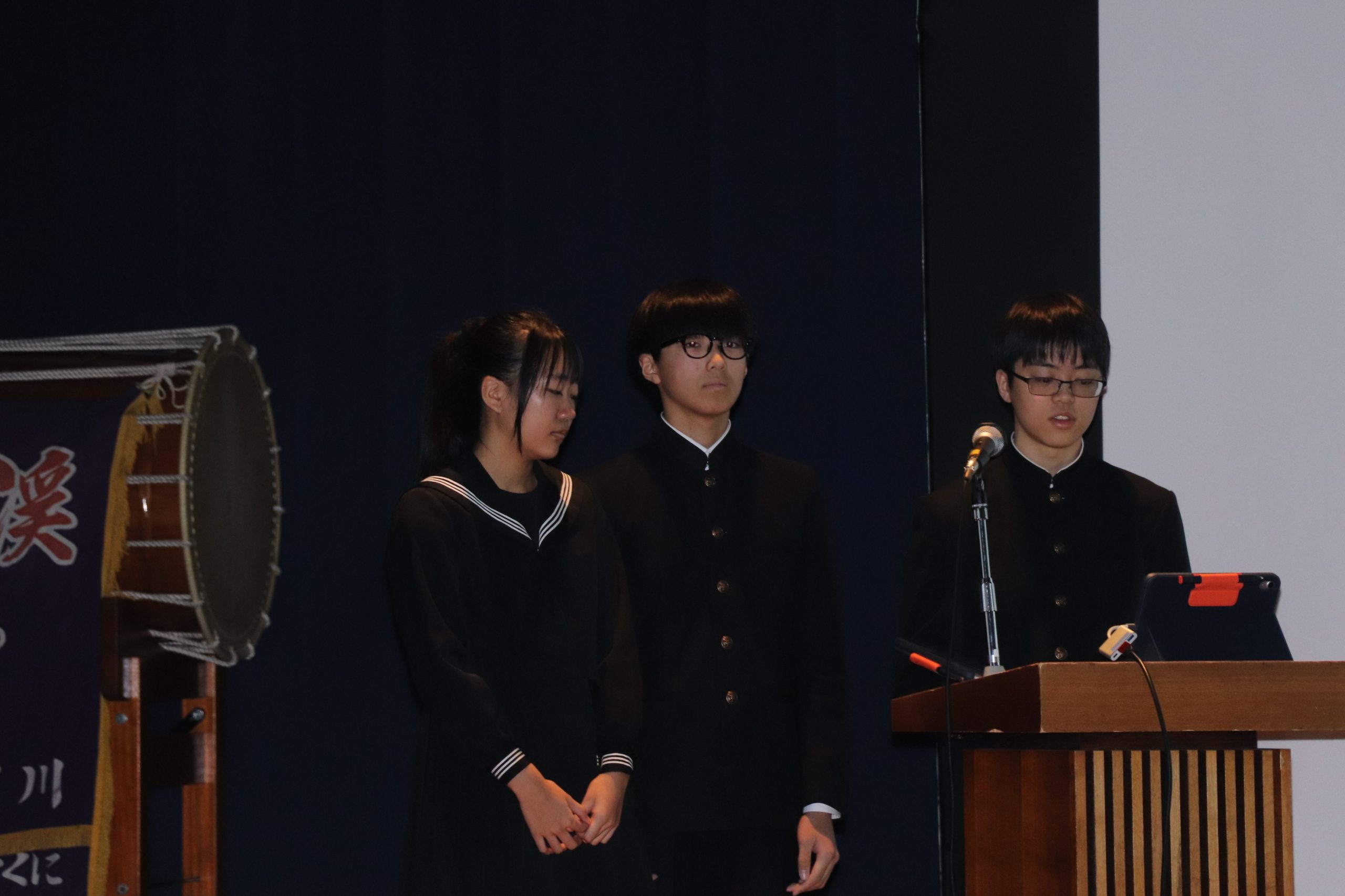 「農家の後継者を増やす」と題して、小澤虹翔さん、菅野陽翔さんが発表。農業人口の減少や高齢化などについて触れ、農業に関する小学校のクラブ活動強化、農業機械のうどん祭り会場での展示などを実施し、農業に関心を持つ人の増加などを訴えた。