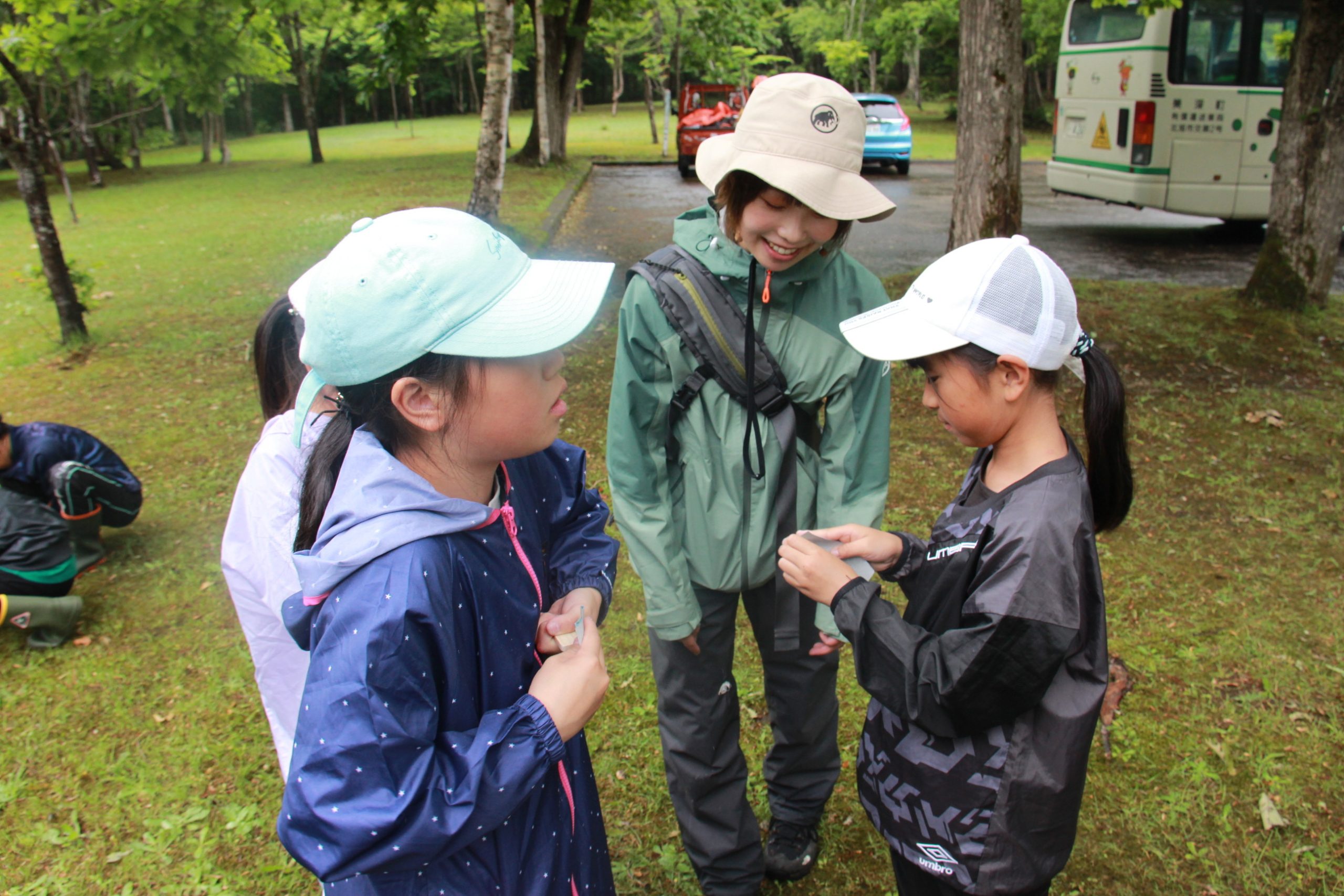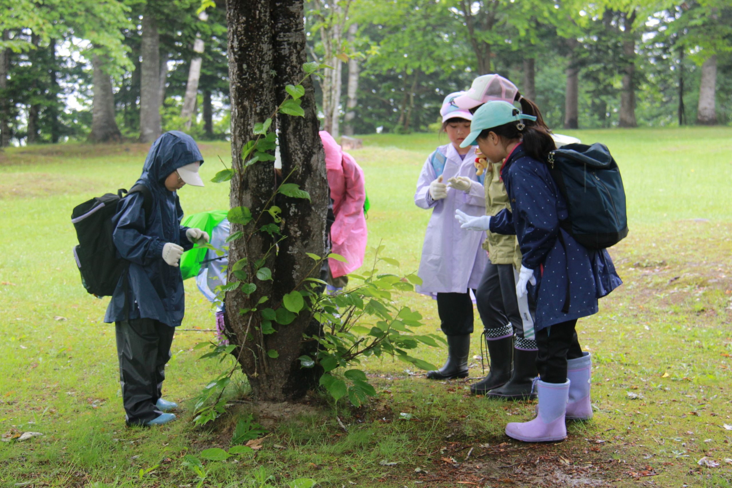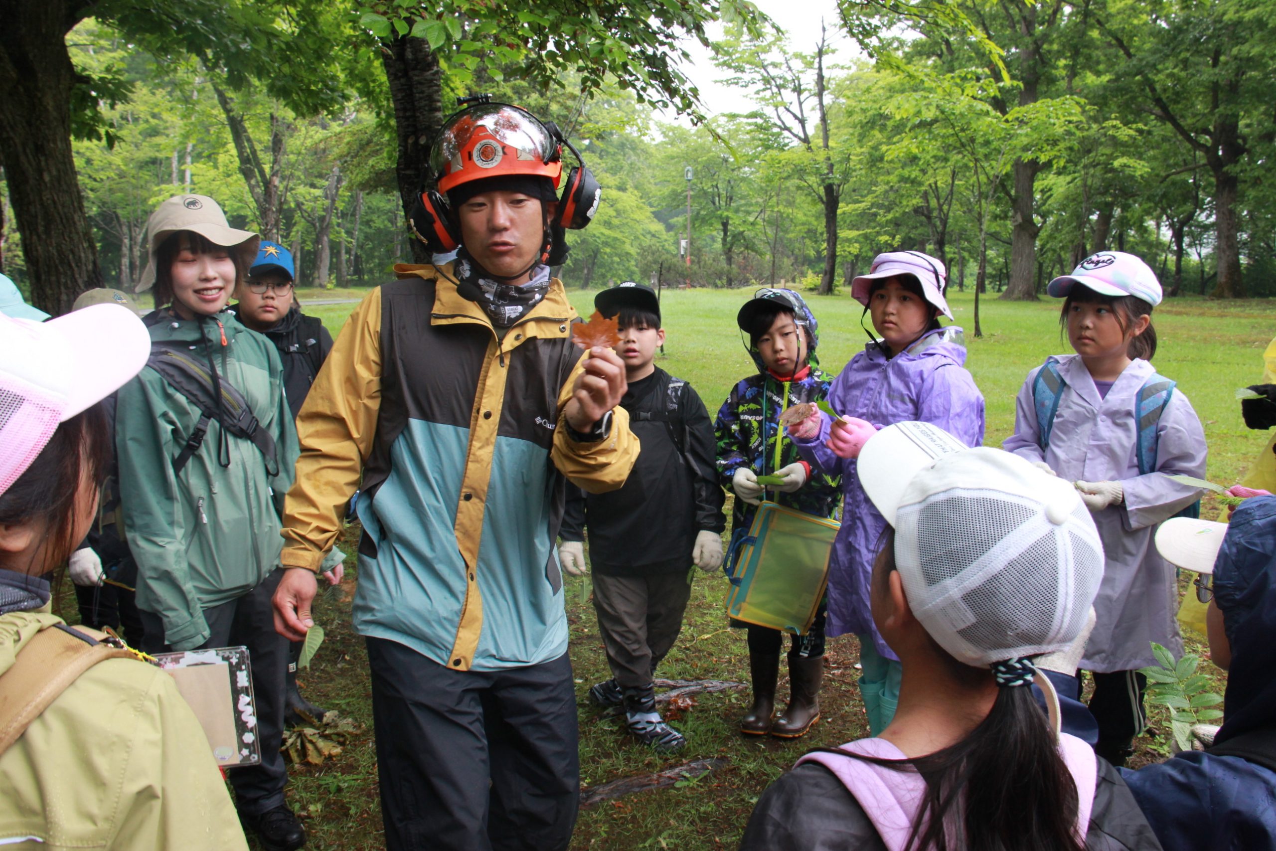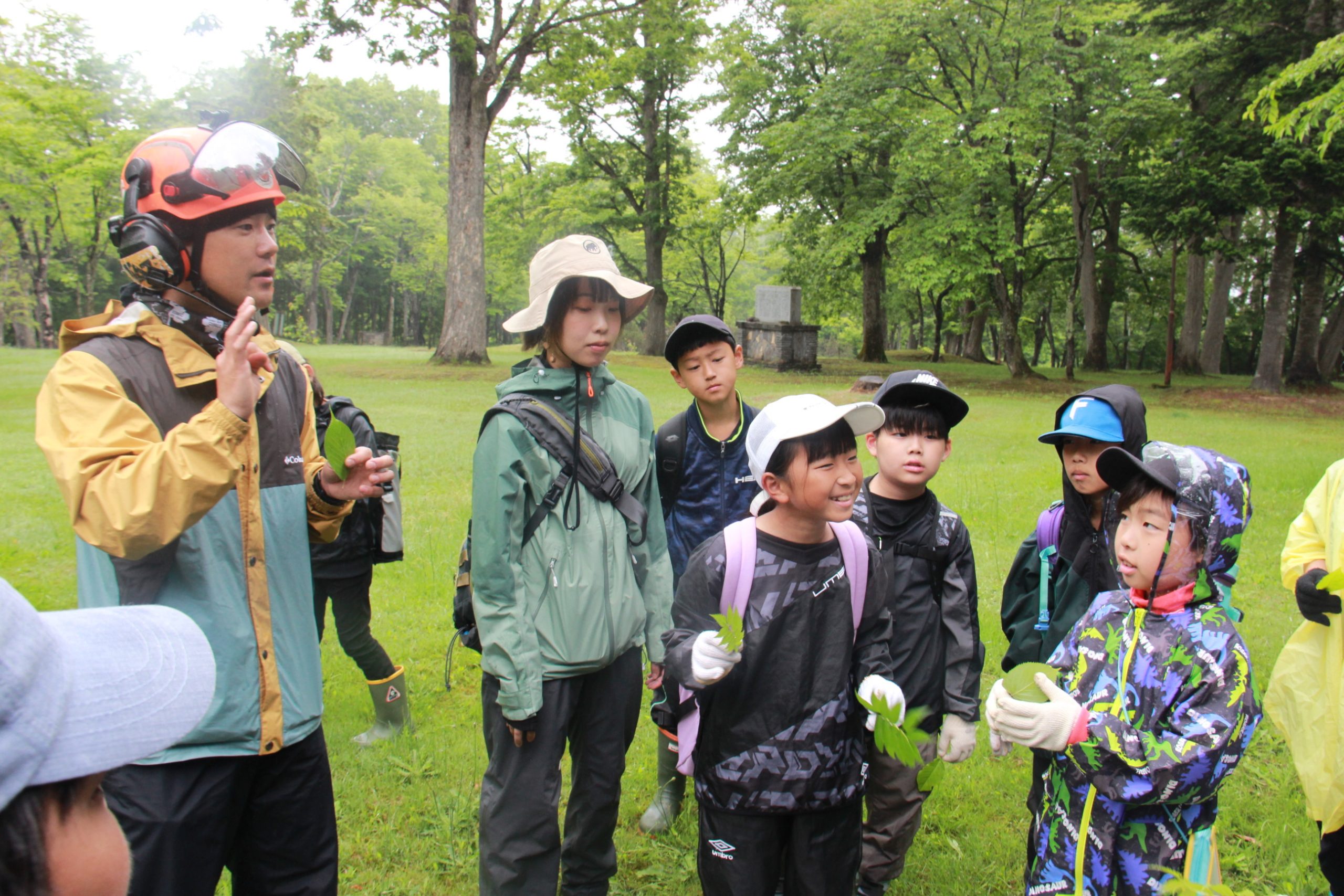 前半は樹木について学び、葉を採集。サクラやトドマツ、ナナカマドなどの葉を見つけるとともに、葉の形や特徴によって樹種が見分けられること。