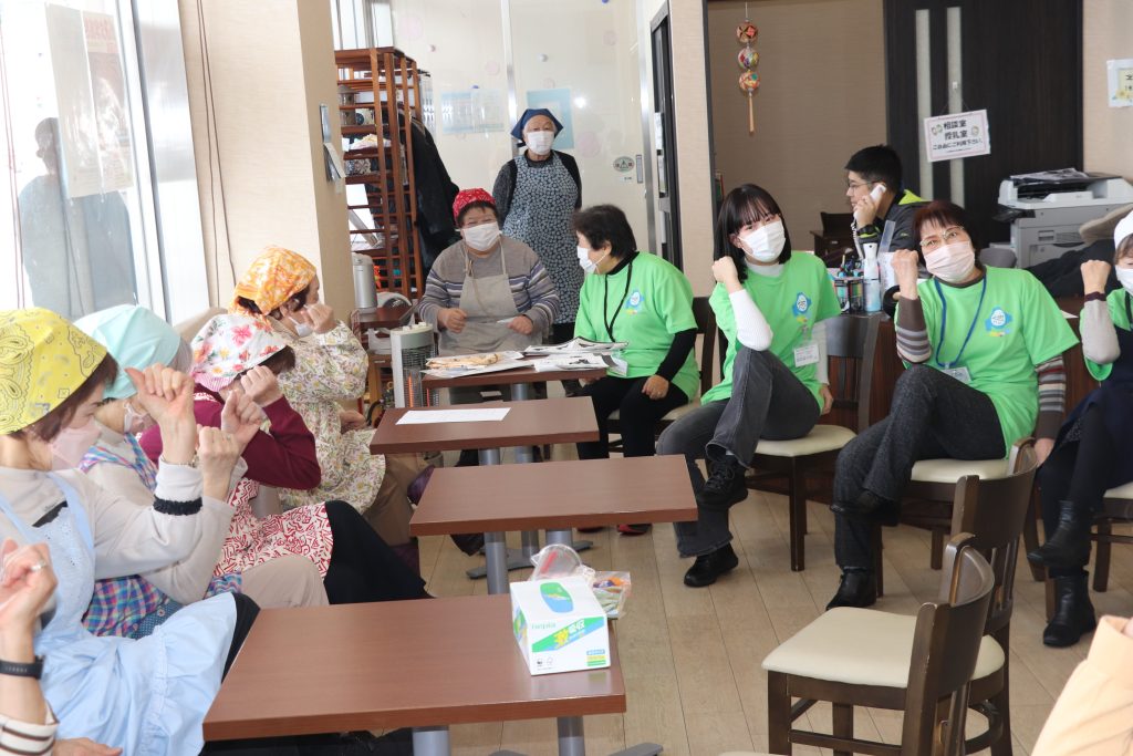 はじめに、全員で予防体操を行い、椅子に座ったままで身体を動かし、足で後出しジャンケンなどを実施。身体と脳の両方をトレーニングした。