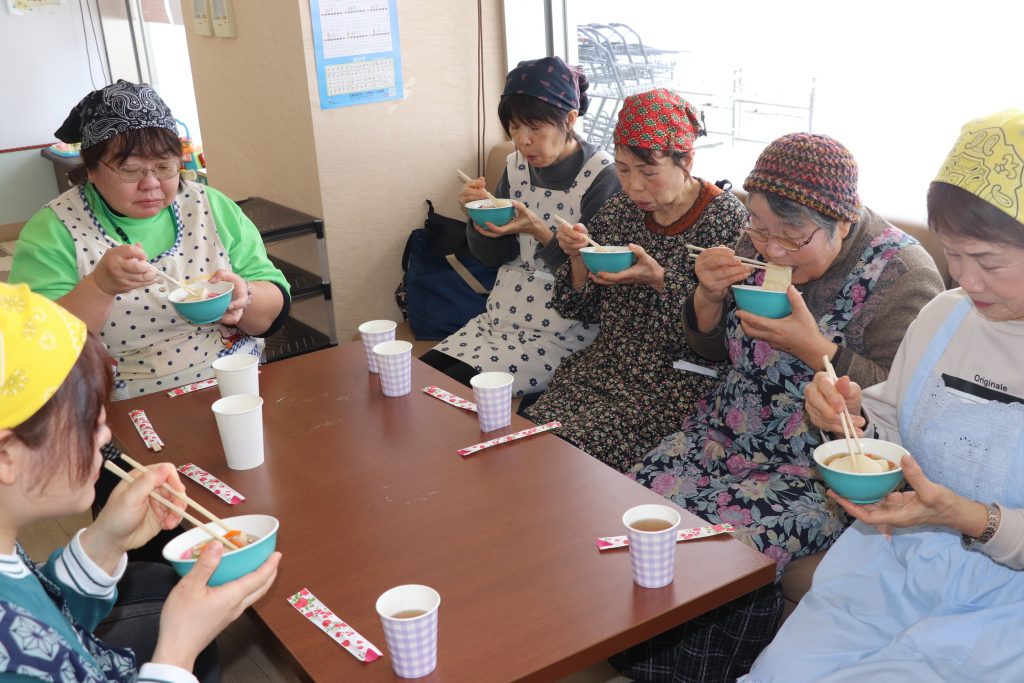 雑煮を作り、食べる前に「お口体操」を行い、「イー」「ウー」などの言葉を発声。「お餅を食べる時は30回かんでください」と指導され、全員で試食した。