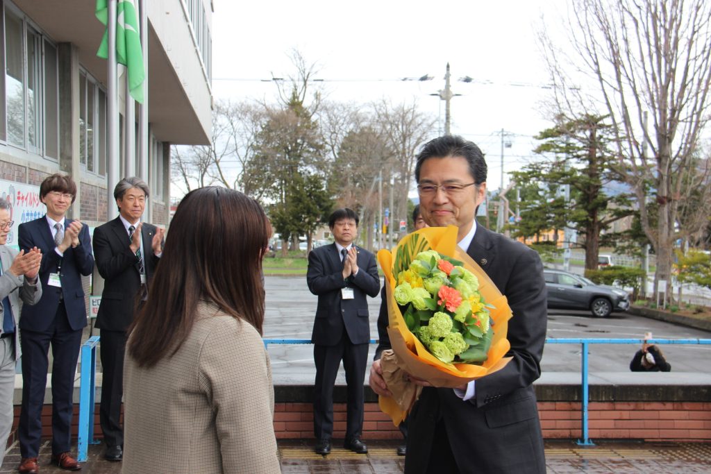 任期満了に伴う名寄市長選挙で5期目の当選を果たした加藤剛士市長(55)の初登庁セレモニーが、23日午前8時45分から市役所名寄庁舎前で行われた。加藤市長は、庁舎前で出迎えた職員たちの前で晴れやかな表情を見せ、セレモニー後の就任式で抱負を語った。