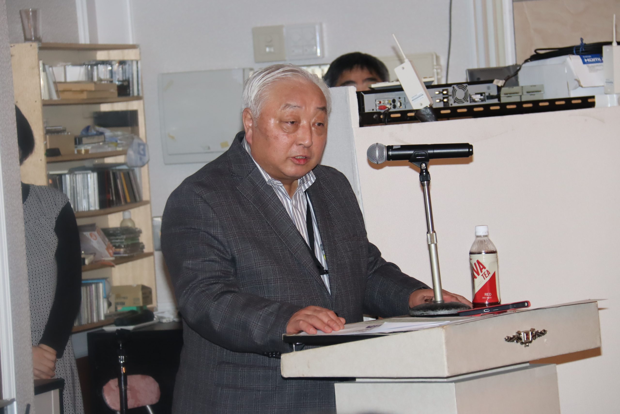 中野秀敏道議会議員の発声で祝杯を挙げ、参加者はグラスを交わしながら和やかな雰囲気で交流を深めた。
