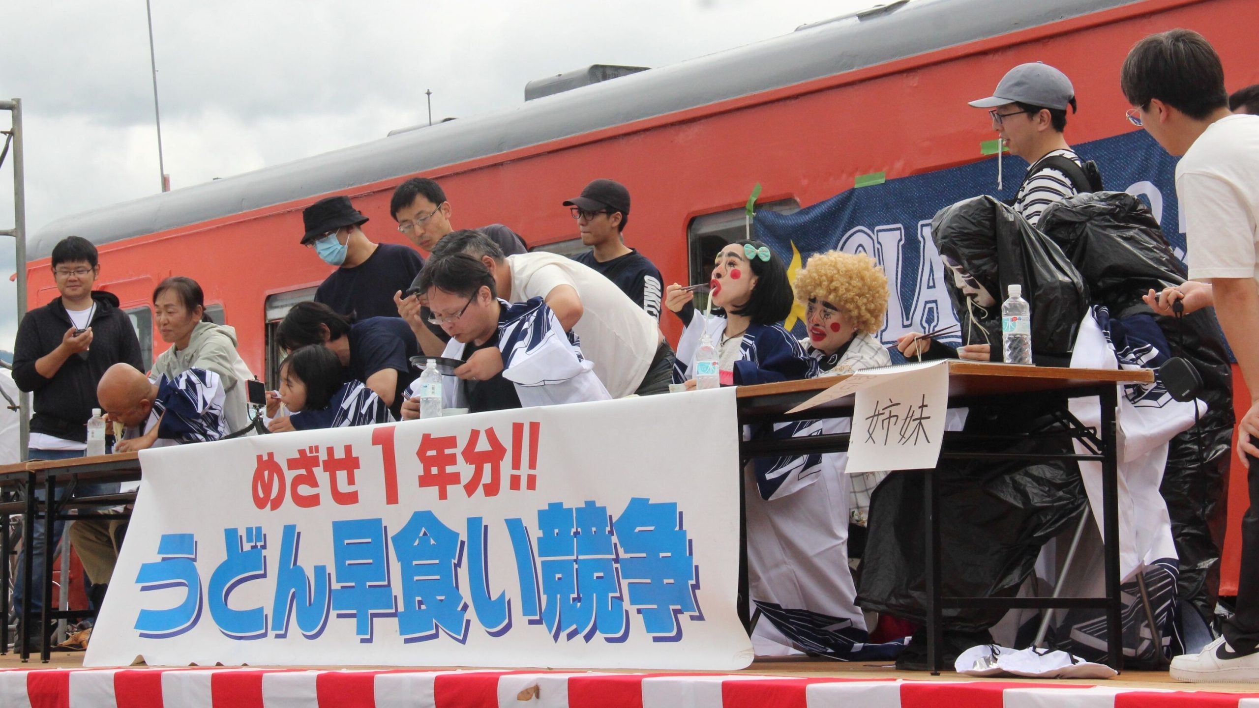 2日目は、小学生向け新企画「うどん何gでしょう?」と、9年ぶりに復活した「うどん早食い競争二人羽織」が行われた。