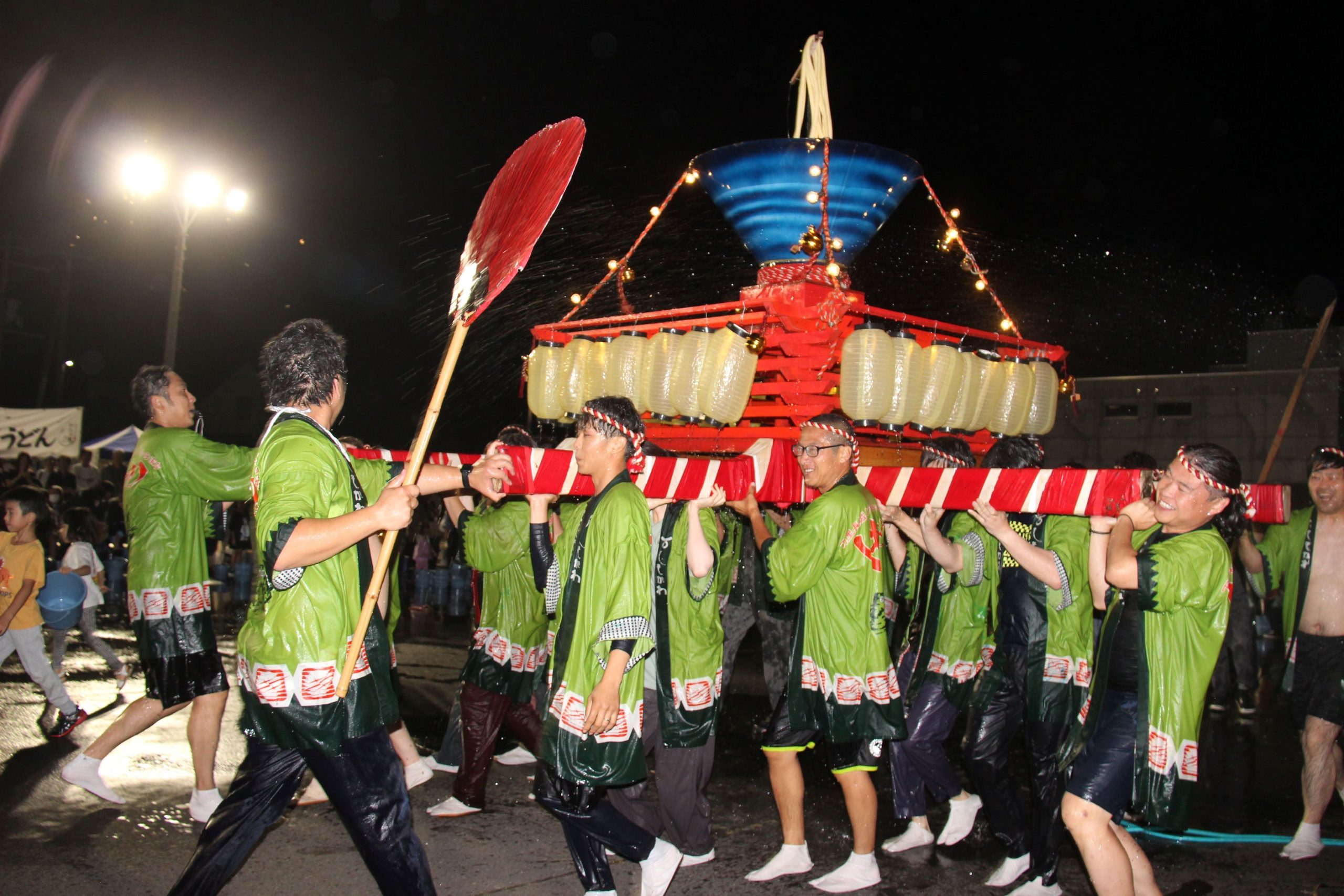 初日を締めくくるステージイベント「ふるさとどんちゃん」では、町のイメージキャラクター“しもりん”のパネルを載せた「子どもみこし」を地元の小学生らが、大きなうどんの模型を載せた「どんちゃんみこし」を有志20人以上が担いで巡行。来場者による水かけも行い、みこしを清めた。餅まきも盛り上がった。