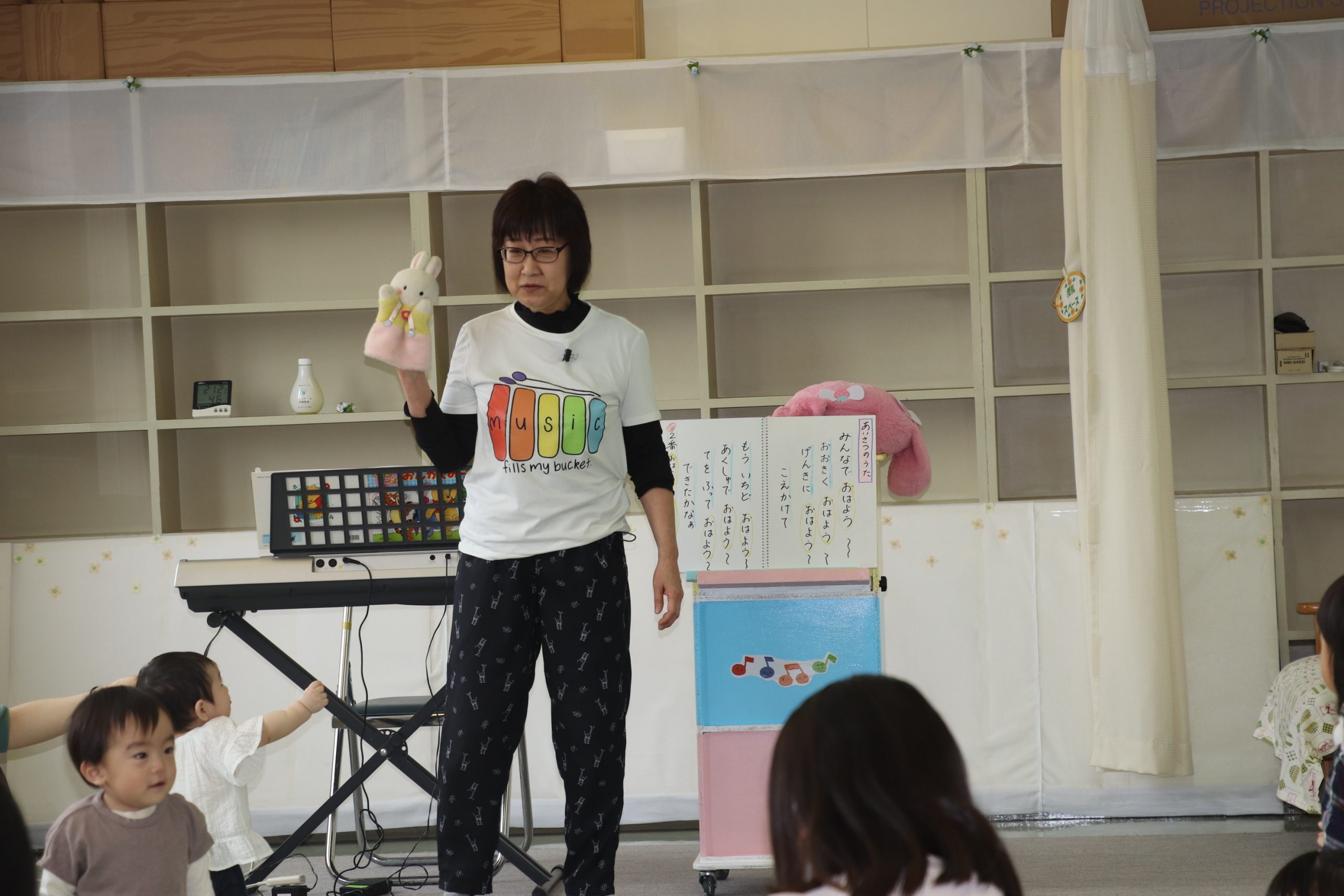 紺野所長が、「今年初めての親子講座です。音楽を通して体を動かし、けがのないよう楽しんでください」と挨拶。上田さんも、わくわく人形を持って挨拶した。