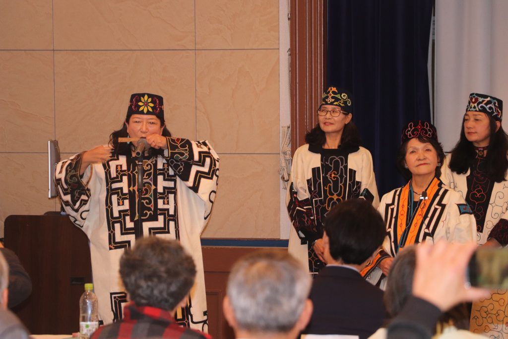はじめに、札幌市を中心にアイヌ文化の魅力を伝える活動をしている「レラ・マウカ」が、アイヌ伝統の歌や踊り、器楽演奏などを披露。樺太アイヌの流れをくみ、戦後は豊富町の開拓地区で日本人と一緒に生活してきた―などのトークを交えて、歌や踊りを披露し、最後は、栗原会長らも輪になって一緒に踊った。