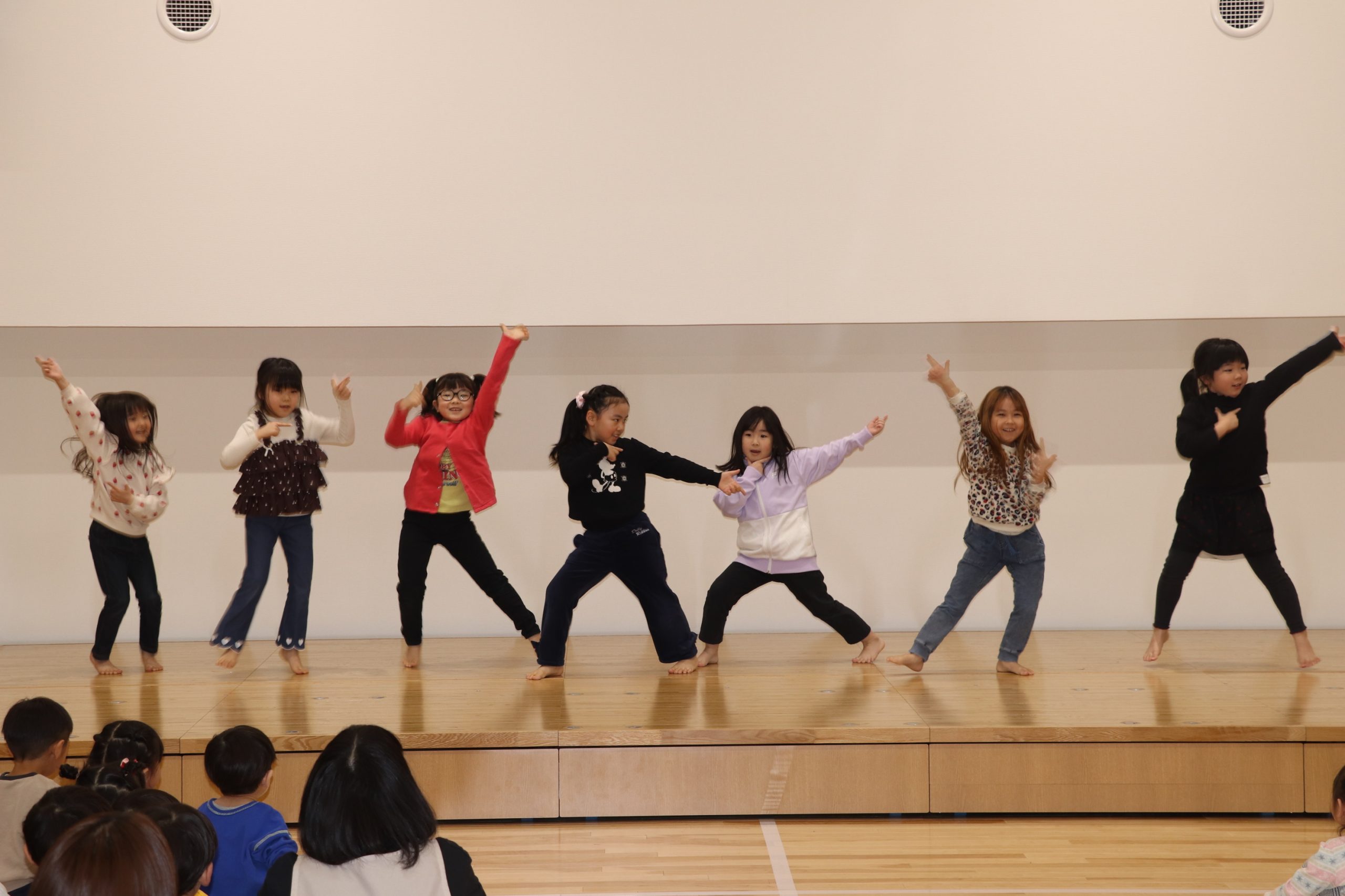 卒園するぽぷら組の女児7人がダンス「バブルバブル」を披露。素晴らしい踊りに、園児たちも職員も大喜びで盛り上がった。