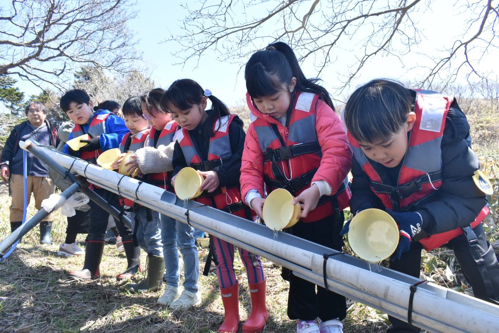 このあと、追久間内川に移動し、児童達は稚魚が入ったカップを手に「元気でね」と川に繋がるパイプから流し、別れを惜しんだ。今回で累計放流数は11万1千匹となった。(千葉大輝)