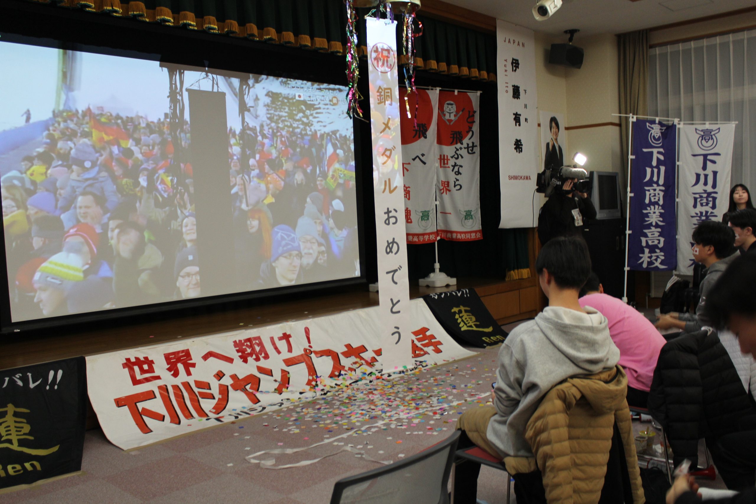 下川商業高校出身の二階堂蓮選手(日本ビール)は、ミラノ・コルティナ2026オリンピックのスキージャンプ男子個人ノーマルヒルと男女混合団体で銅メダルを獲得。競技当日は両日とも、ハピネスでパブリックビューイング(PV)が行われ、深夜にもかかわらず多くの住民が熱い声援を送り、歓喜の瞬間をくす玉で祝った。