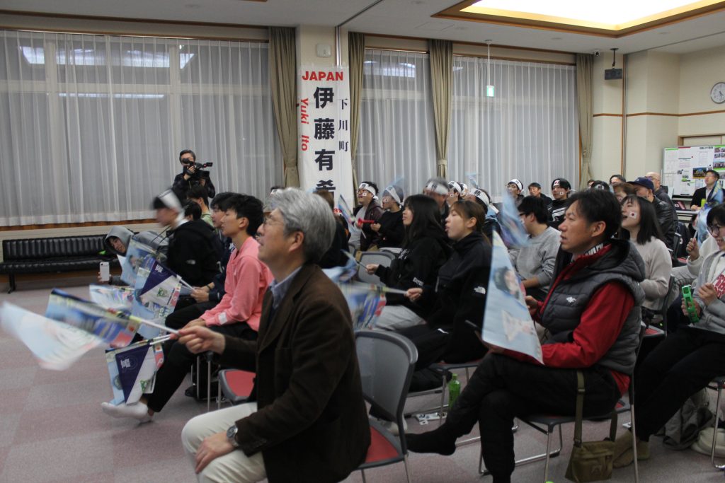 参加者は、二階堂選手の小旗を持って熱心に応援。1本目を終わって僅差で6位につけた。メダル圏内とあって、集まった多くの参加者は逆転を信じ、大いに盛り上がった。