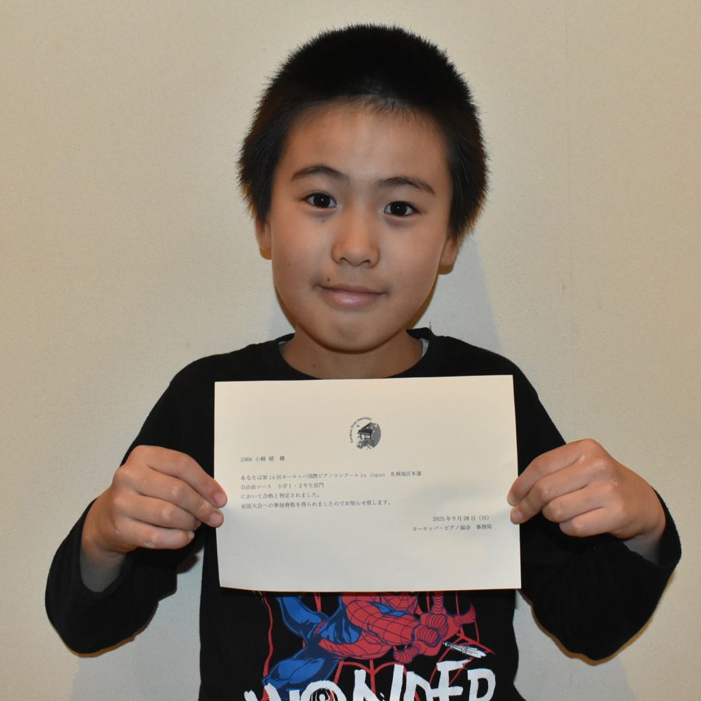 第16回ヨーロッパ国際ピアノコンクールinJAPAN札幌地区本選(ヨーロッパ・ピアノ協会主催)が札幌のエルムホールで開かれ、稚内中央小2年の小柳暖さんが合格の判定で、11月23日から12月28日にかけ、週末に部門ごとに東京都で開かれる全国大会への参加資格を得た。小柳さんは「全国大会に出れることになりすごく嬉しい」と喜んだ。