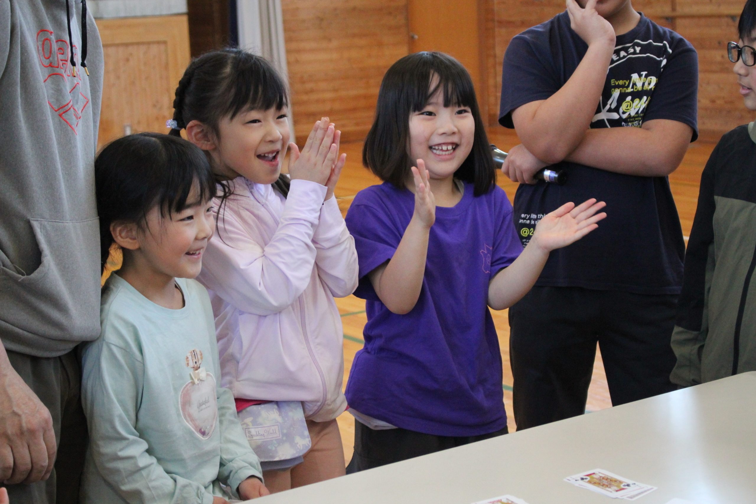 縄跳び(2年生)、カードを用いてのテーブルマジック(4年生)、一輪車(5・6年生)、画の作品紹介(2・6年生)など、ユニークな自己紹介で1年生を喜ばせた。