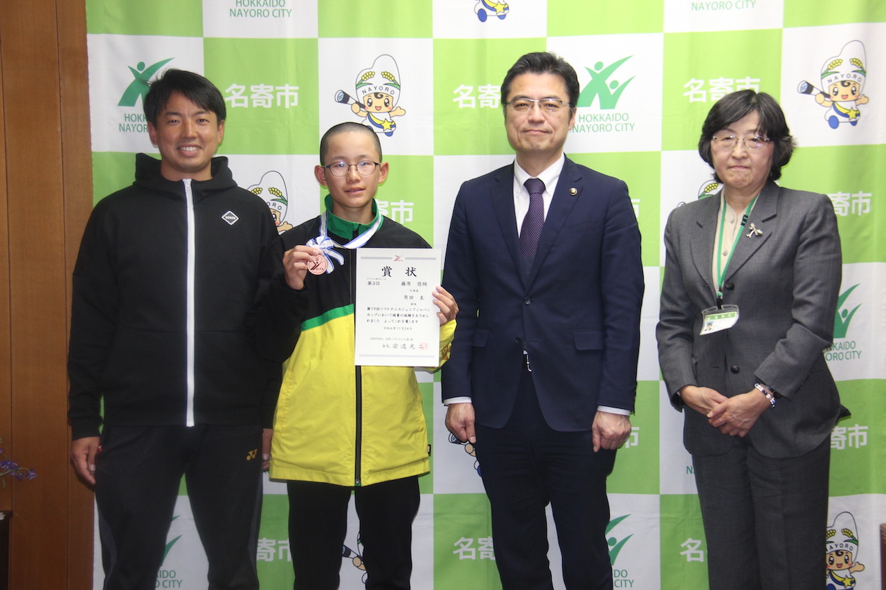 名寄中学校男子ソフトテニス部キャプテンの藤原悠綺君(2年生)が、第19回ソフトテニスジュニアジャパンカップのダブルス男子U―14で3位入賞の好成績を収めた。藤原君は18日午後4時に市役所名寄庁舎を訪れ、加藤剛士市長らに結果を報告した。