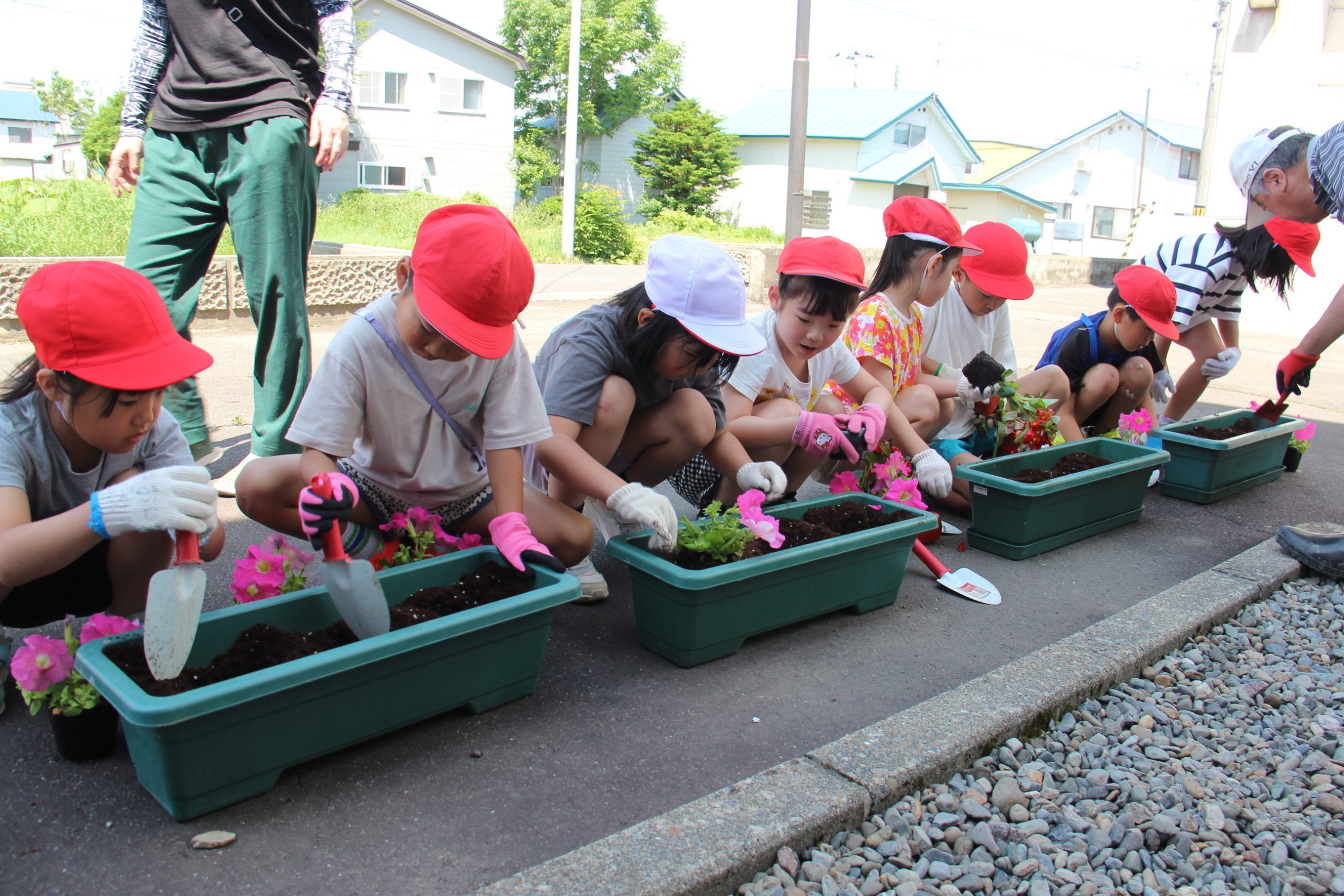 名寄西小安心会議(木田雅博会長)による西小学校(松本敏朗校長)プランター整備活動が、19日に同校正面玄関前で行われた。同校1・2年生と地域住民が、マリーゴールド、ベゴニア、ペチュニアの花苗をプランターに定植。交流も深めながら学校周辺をきれいな花で飾った。