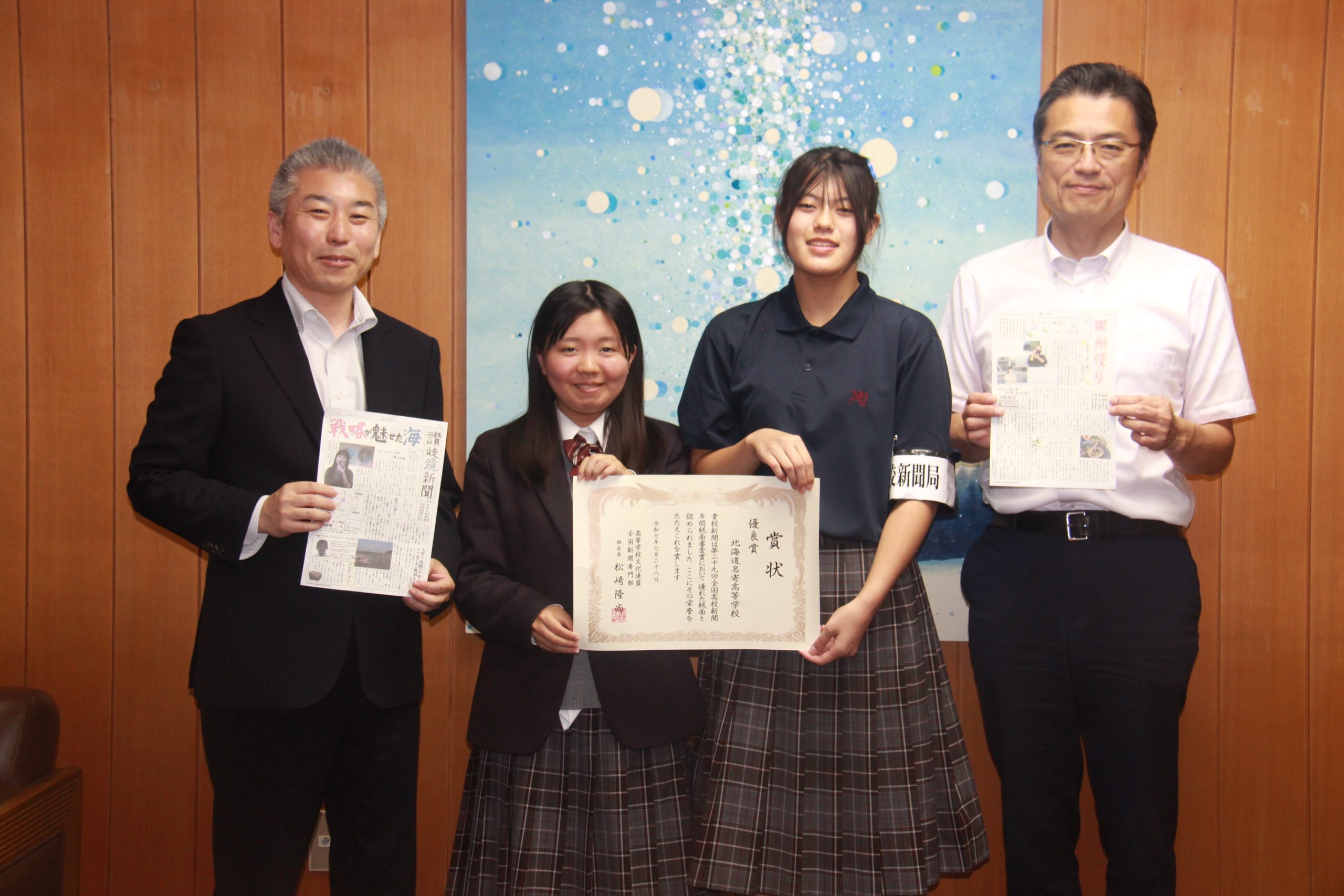 名寄高校新聞局(阪本歩局長、局員8人)は、第49回全国高等学校総合文化祭(かがわ総文祭2025)の新聞部門で行われた第29回全国高校新聞年間紙面審査賞で、優良賞を受けた。総文祭に参加した元局員の本郷遥さん(3年)、副局長の鈴木亜実さん(2年)が19日に市役所名寄庁舎を訪れ、加藤剛士市長に結果を報告するとともに、他校生徒との「交流新聞」作りを語った。(9月23日掲載)