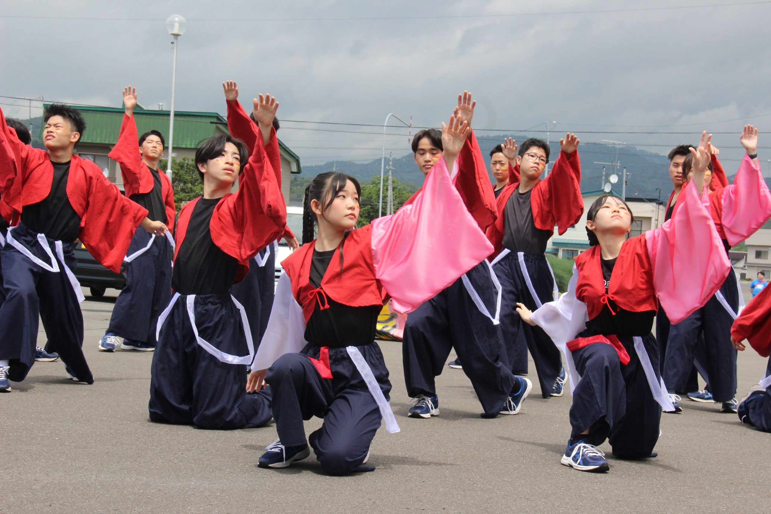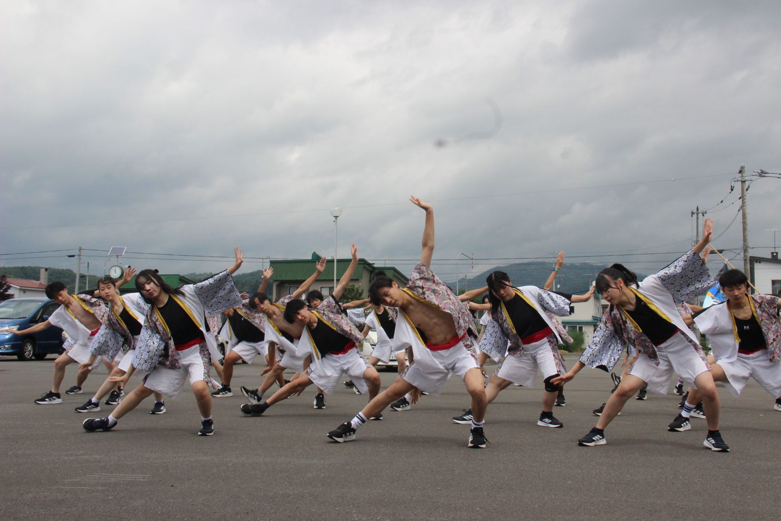 2日目は手作り衣装をまとい、特養老人ホームあけぼの園前で施設利用者や地域住民にパフォーマンスを披露。朝まで降り続いた雨も上がり、来場者の声援を受け、見応えある踊りを発表した。