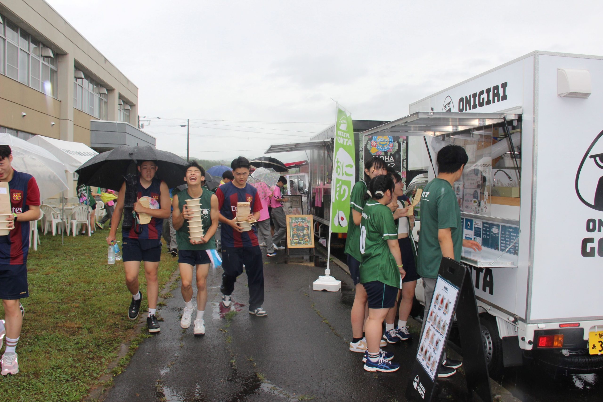あいにくの雨だったが、屋外にキッチンカー3台が並び、こだわりの料理を提供。雨除けのテントの下で会話を弾ませながら味わった。北海道和種馬・ハナとのふれあいコーナーも設けた。