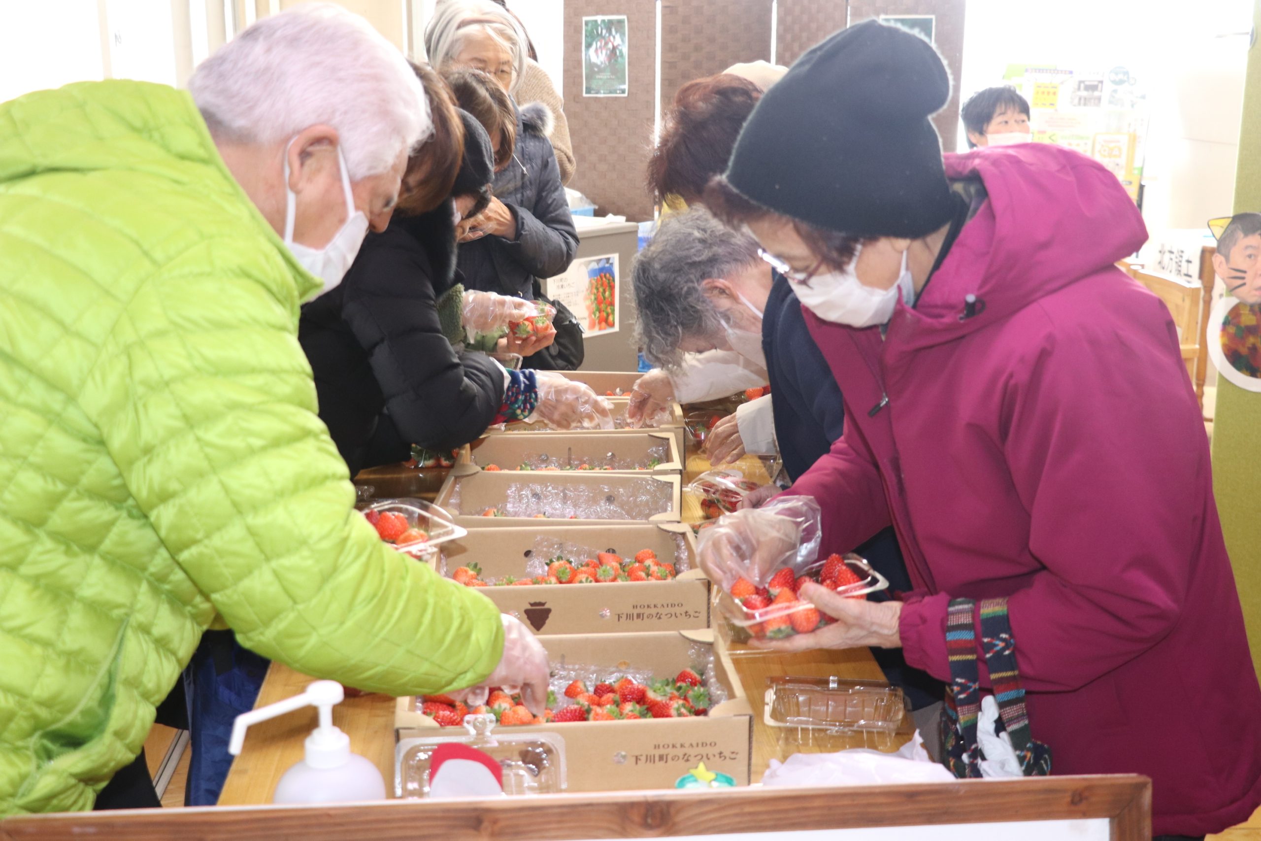 人気商品は、戸田建設一の橋農場のイチゴで、1パック500円(1人2個まで)で詰め放題のイチゴを、パックいっぱいに詰め込んでいた。用意した14箱と追加の2箱、合計16箱を全て売り切った。