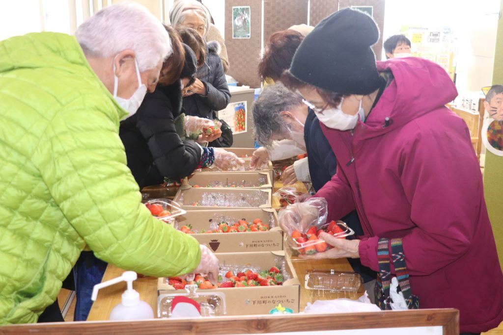 イチゴのパックを買った町内の山口弘子さんは、「一の橋の“ちいきしょっぷ”も利用しています。役場での開催を楽しみにしていました。今日はイチゴを買えたのでうれしいです」などと笑顔で語った。