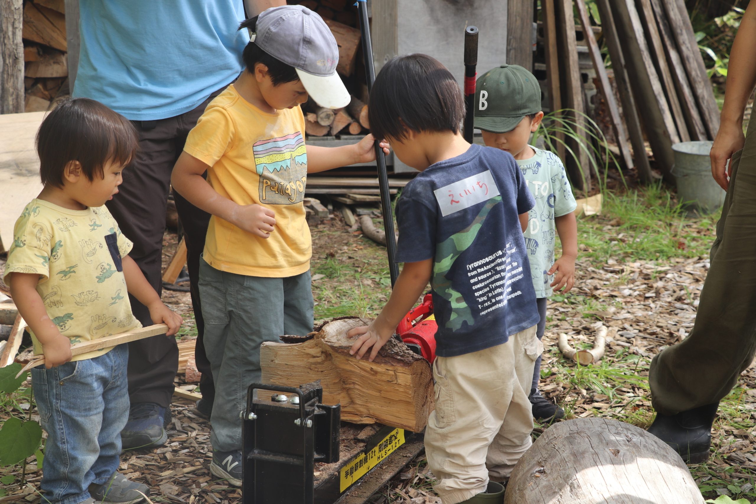 子どもたちの希望で、嶋村さんや森の生活の職員らと一緒に手動薪割り機「剛腕君」を使っての薪割り、テーブルホッケー、ベニヤ板の滑り台などを作り、テレビ番組の「逃走中」をまねた遊びも実施した。「逃走中」では、子どもたちから「ハンターをやりたい」などの声も出され、伸び伸びと遊ぶ様子が見られた。