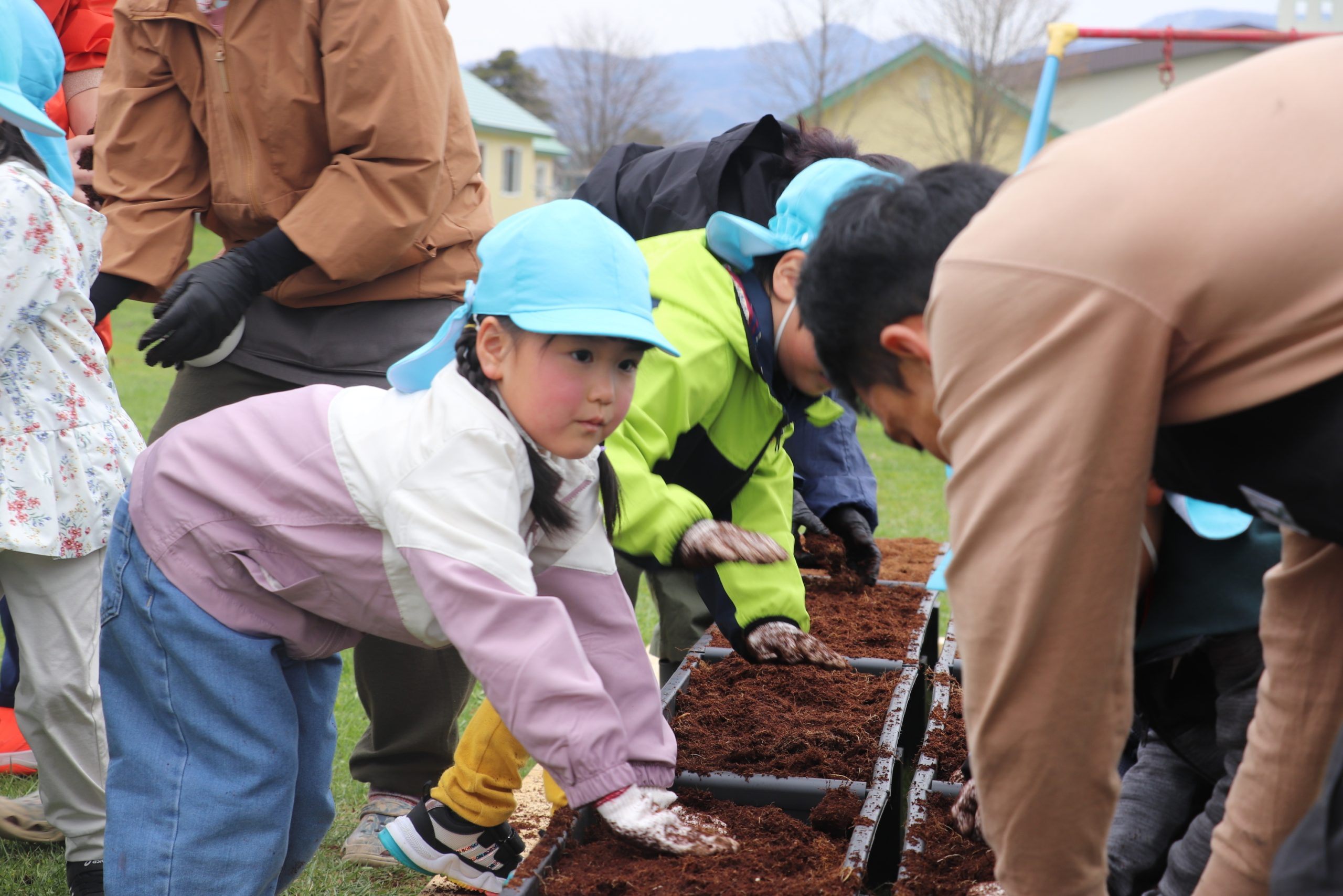 園庭に移動した後、園児たちは、事前に用意されたヤシガラ(ヤシの実の中果皮を細かくしたもの)をプランターの中に移して苗を移植。