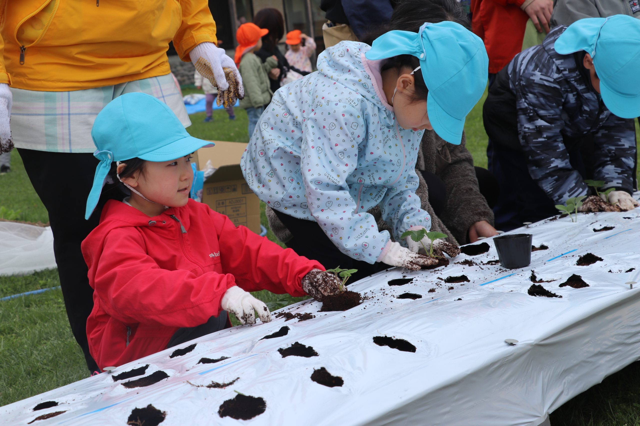 園児たちは、戸田建設社員に倣って、軍手をはめた小さな手を真っ黒にしながら全部で80株のイチゴの苗を移植。移植後はトンネルを被せ、立派なイチゴがなるよう願って笑みを見せていた。