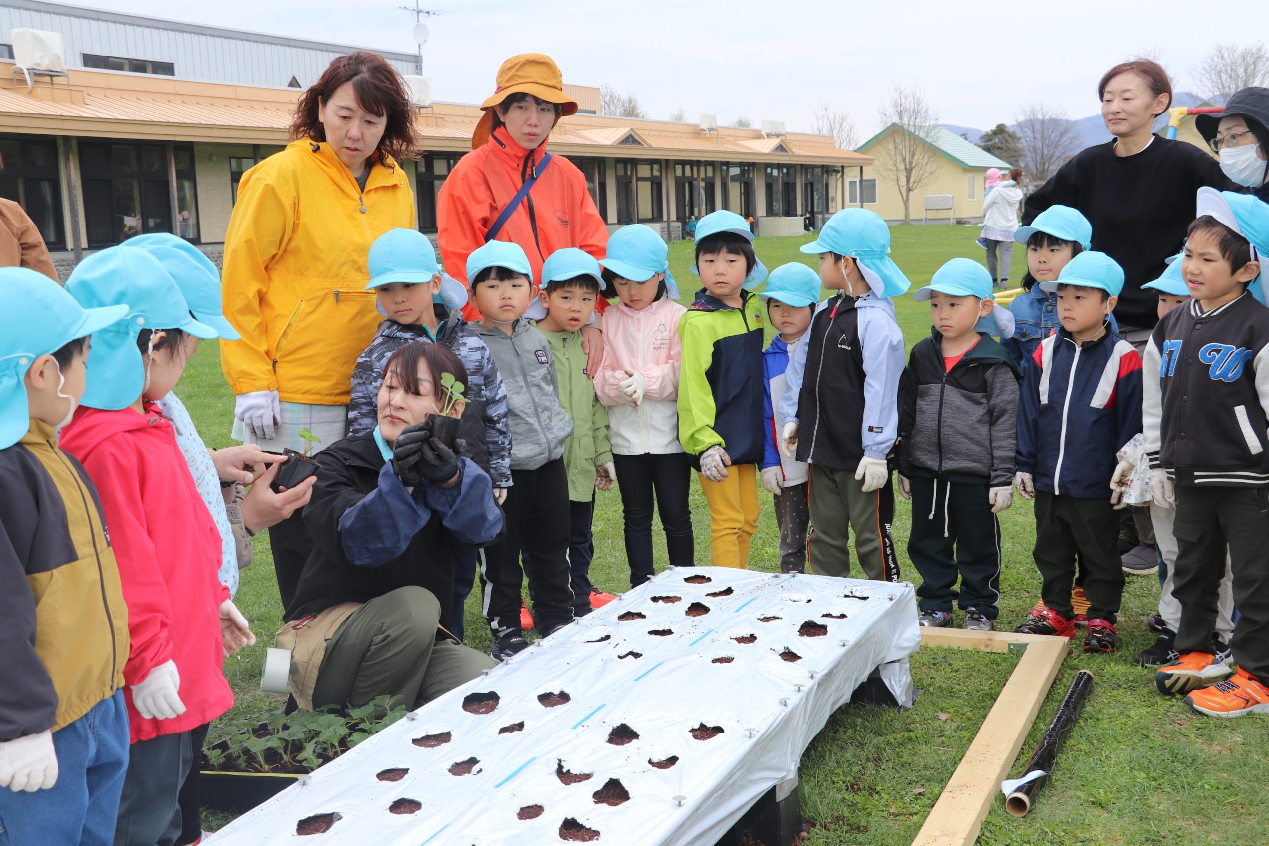 下川町認定こども園「こどものもり」(古屋いづみ園長、園児64人)で、イチゴの苗植えが9日午前10時から同園の園庭で行われ、5歳児が苗を植え、3・4歳児は見学した。