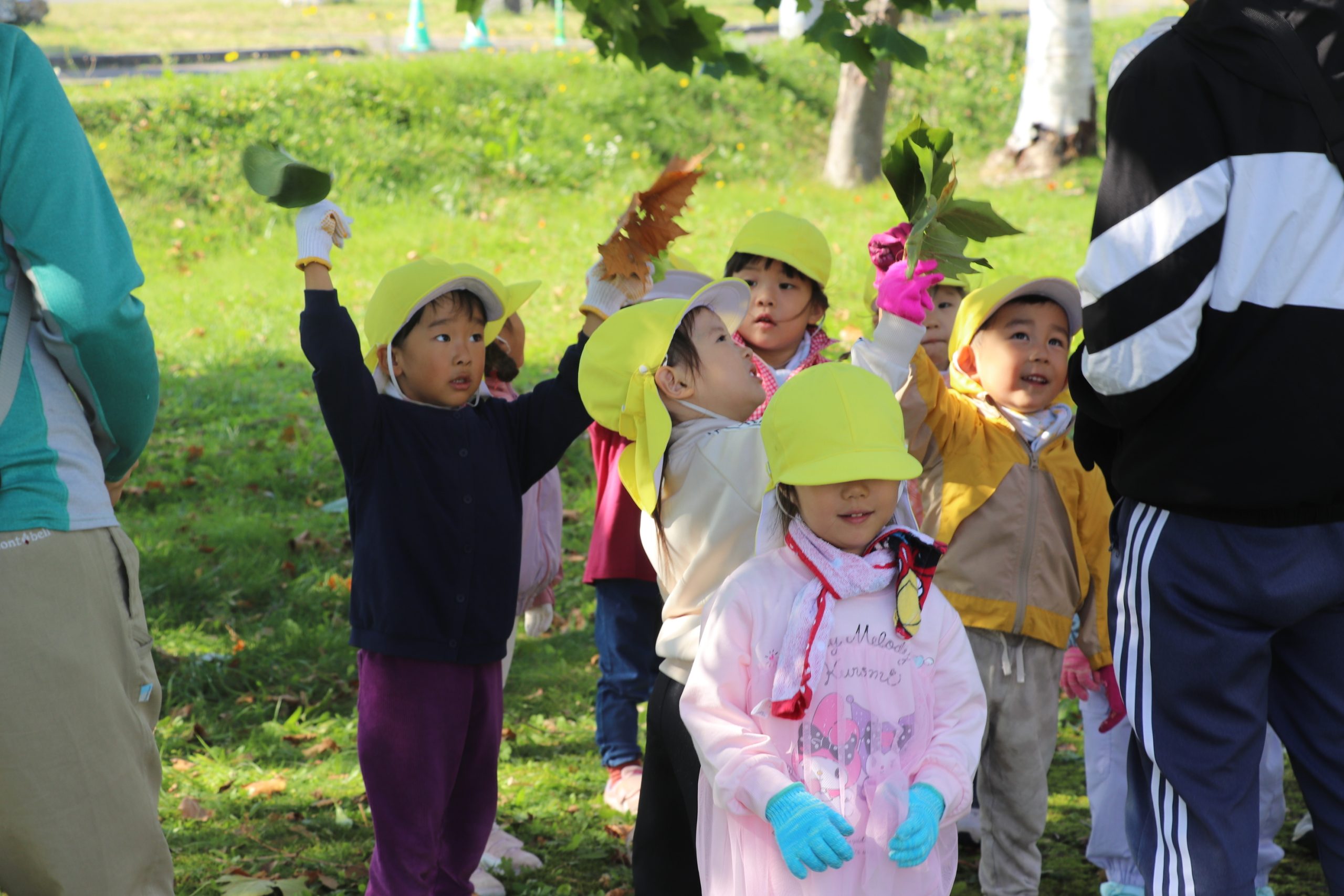 職員や園の先生と一緒に、好きな色の葉っぱを拾ったり、集めたりした。園児からは「大きいのを見つけた」「きれいな色」などの声が上がり、トンボなどの虫に夢中になる姿も見られた。