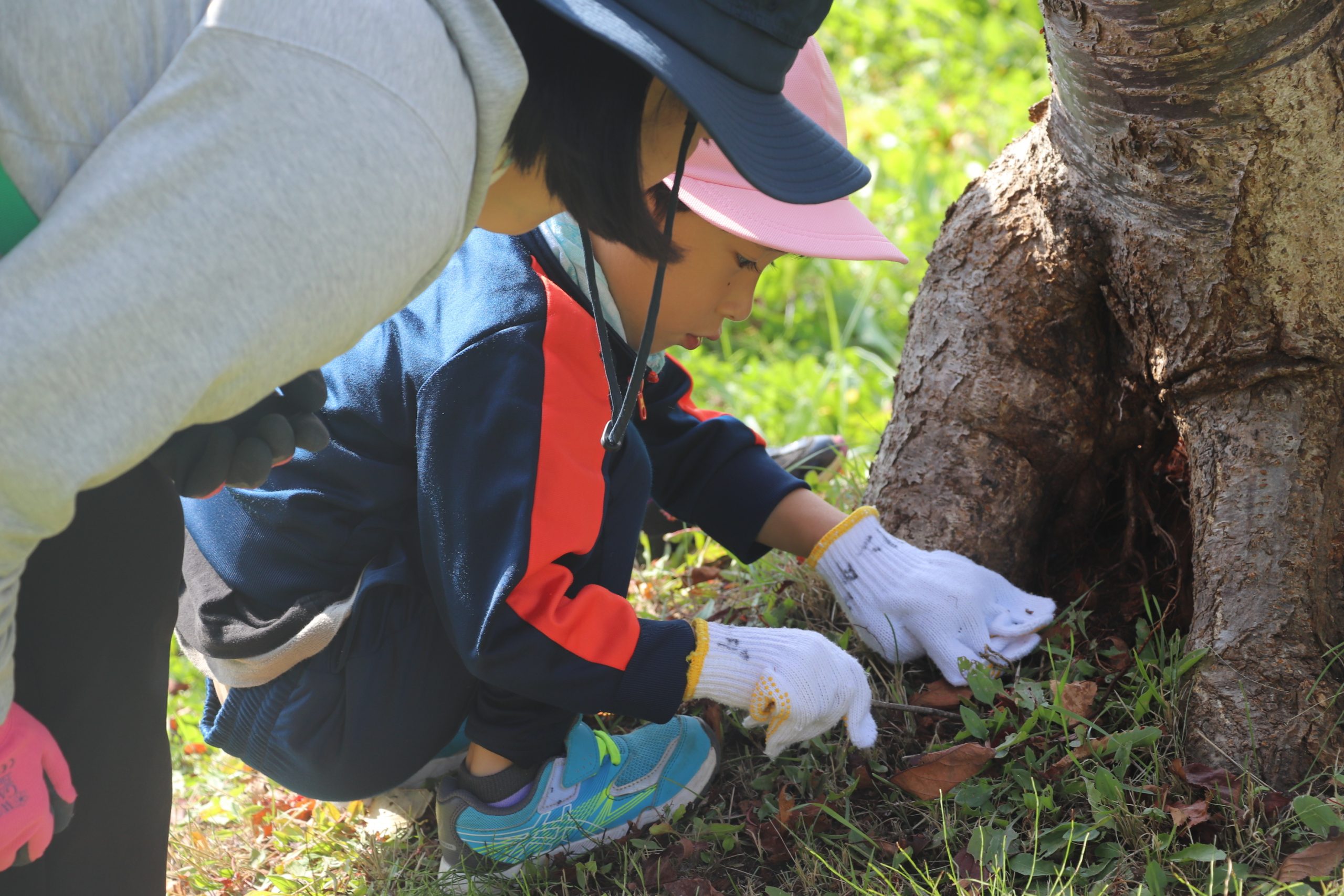 公園では、園児全員が大きな木に向かって「よろしくお願いします」と挨拶し、クラスごとに森の生活の職員が付いて、公園内で自由遊びを行った。