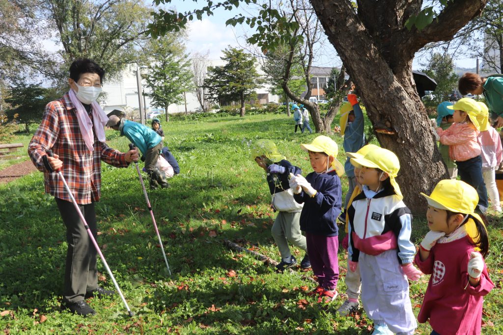 途中、ハピネスで介護予防教室に参加している高齢者が公園を訪れ、園児たちと交流。教室に参加している高齢者らは、笑顔で園児たちに話しかけ、園児たちから元気をもらっていた。