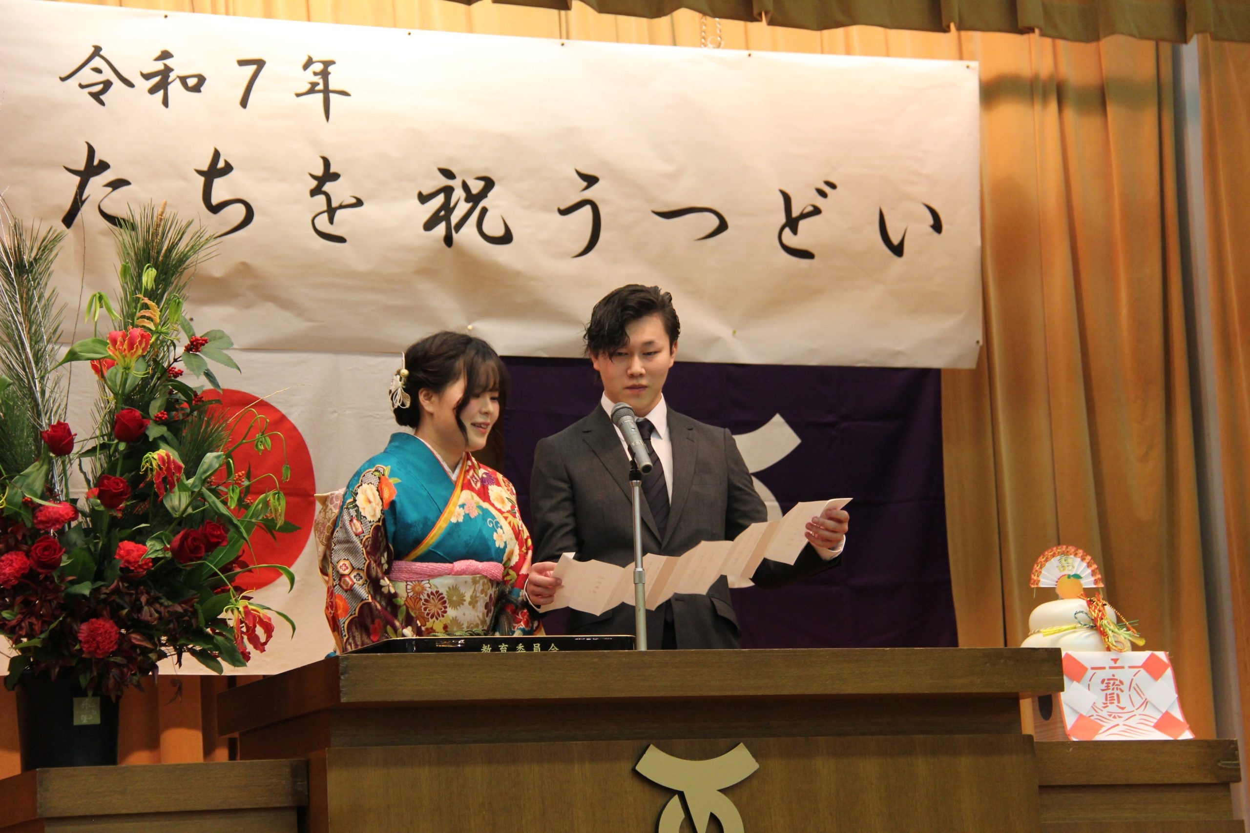 古屋宏彦教育長は、式辞で20歳を迎えた出席者を祝福。「支えてくれた多くの方へ、感謝の気持ちを直接言葉で伝えよう」と話し、情報通信技術や人工知能で変化する働き方などを伝え「目標を持つこと」「挨拶」「相手の考えに興味を持って聞き、自身の考えを伝える『対話』」の大切さを述べ、出席した若者たちの社会での活躍に期待を込めた。