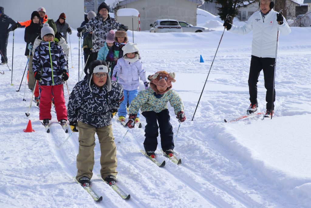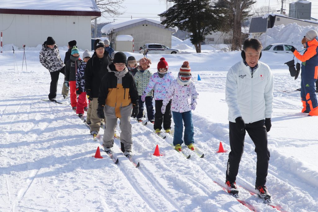 この日は、名寄市スポーツ振興アドバイザーで冬季五輪金メダリストの阿部雅司さんを講師に迎え、同教室を開催。2月10日のクロカン記録会に向けて、全校児童が技術の向上を目指した。