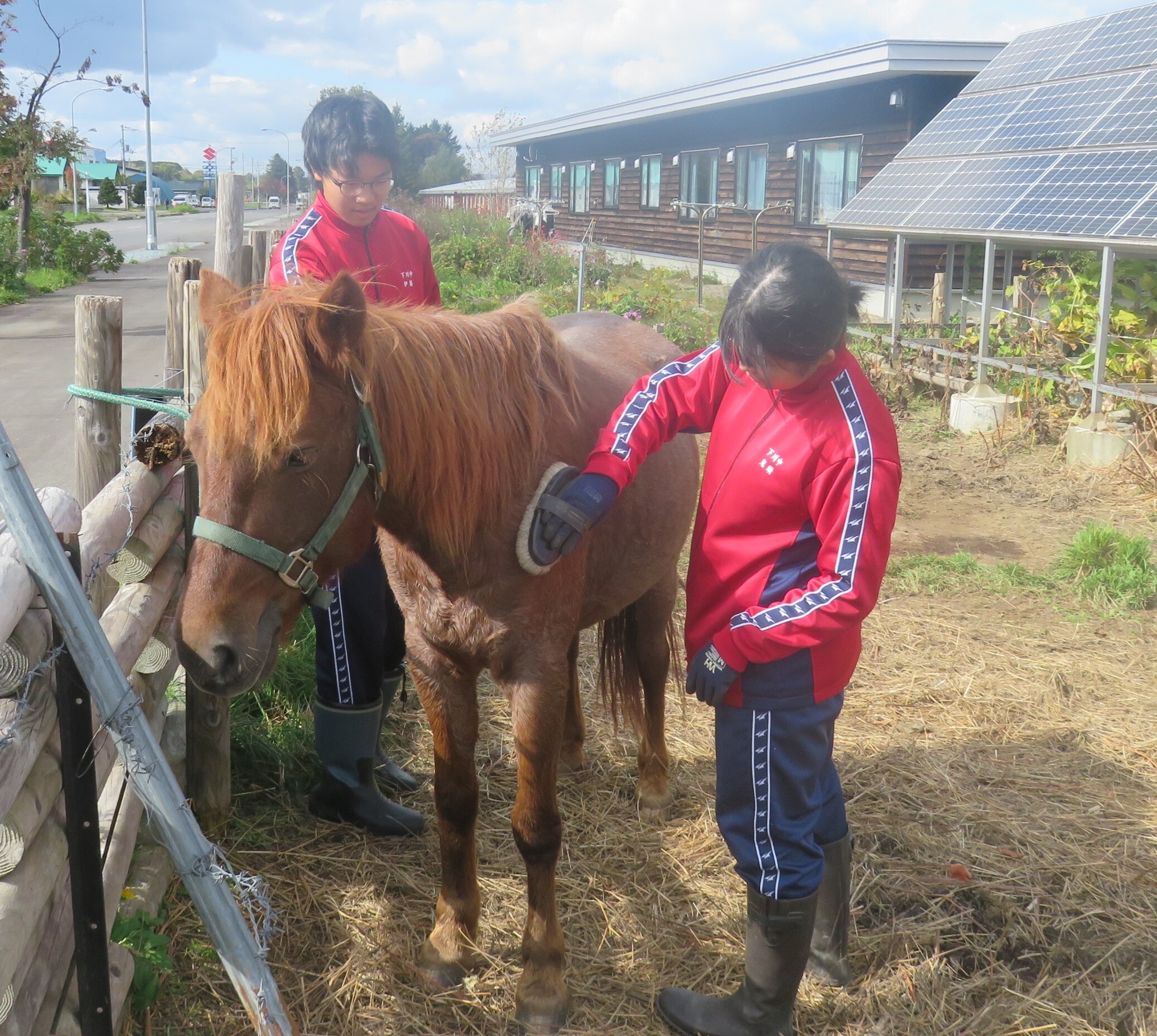 体験先で馬のハナちゃんの調教、ブラッシングなどの世話をやってみました。