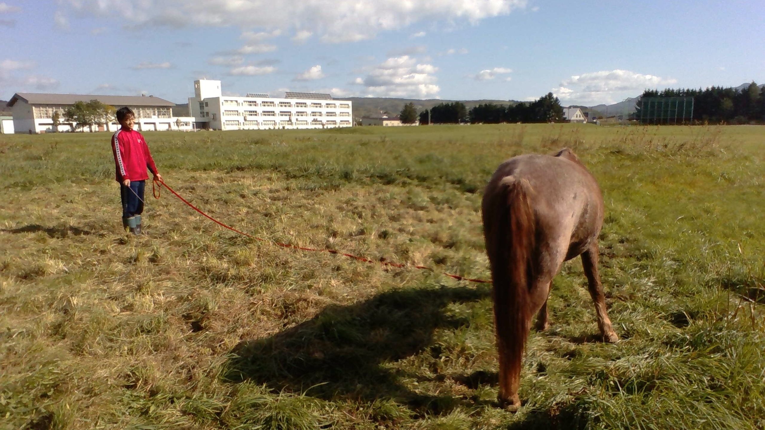 ですが、その体験の中でも難しかったことがあります。それはハナちゃんの調教(馬を離れた場所から、指示通りに動かす)です。小峰さんは声をかけずとも、身振り手振りだけでハナちゃんを動かしていたのですが、僕が声をかけても地面に生えている草をムシャムシャ食べるだけで、まったく指示に従ってくれませんでした。
