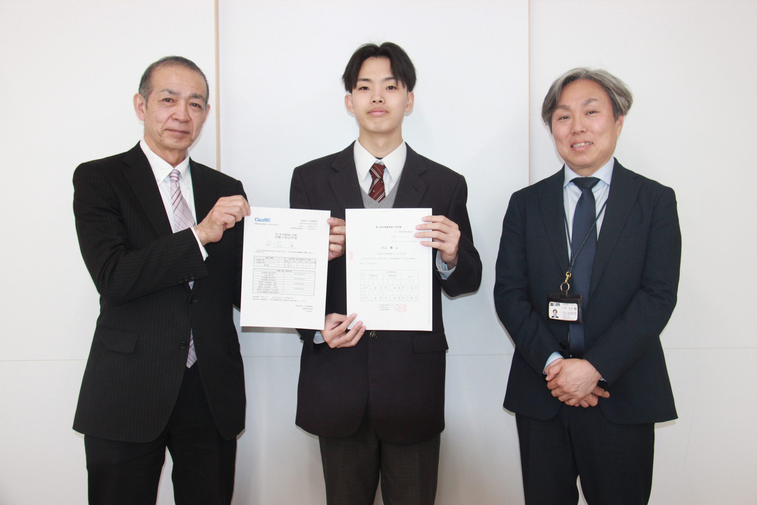 江良営業部長は「自ら興味を持って行動に移し、講習をする前から意識が高く、素晴らしい。3年生の忙しい時期、冬場の実技で大変だったが、センスがあり、操縦は上手。ドローンはいろいろなところで活躍しているので、国家資格を生かし、活躍してほしい」と期待を込める。