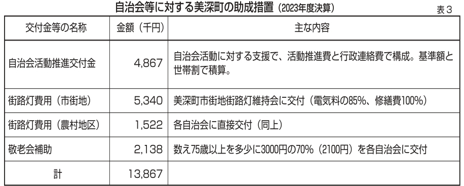 美深町では、敬老会は自治会主催で開催しており、街路灯についても、電気料の一部(15%)を自治会が負担している。町では、残り85%を町が負担し、修繕費は全額負担している。町の自治会等に対する主な支援は表3の通り。