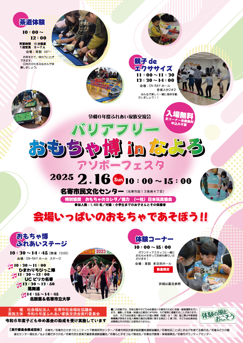 おもちゃ博ふれあいステージ、親子でできるエクササイズ教室、茶道体験、列車・車コーナー、アクティブコーナー、ボッチャコーナー、LaQコーナー、キュートコーナー、体験コーナー、乳幼児コーナーなど盛りだくさん!!全コーナー体験無料。みんな来てね〜!