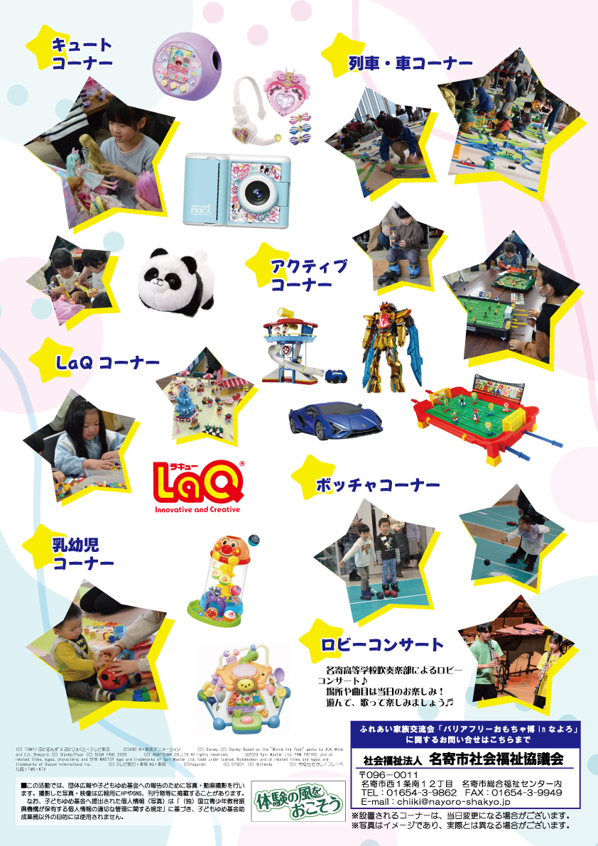 コンサート、楽器体験、親子でできるエクササイズ教室、茶道体験、列車・車コーナー、アクティブコーナー、ボッチャコーナー、LaQコーナー、キュートコーナー、体験コーナー、乳幼児コーナーなど盛りだくさん!!全コーナー体験無料。みんな来てね〜!