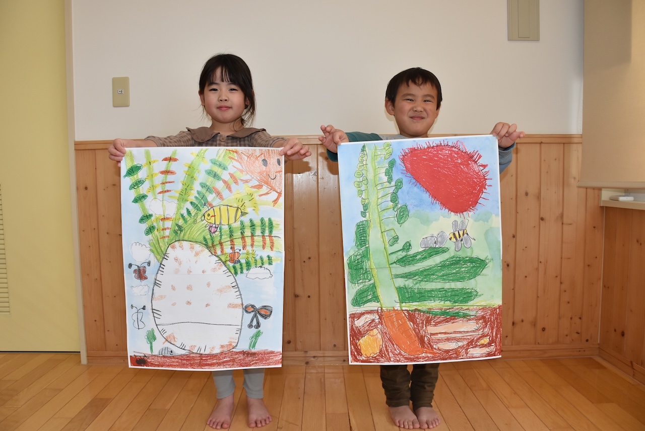2人は秋に同園で収穫した農作物をテーマに大きく育った野菜から栄養を求めた虫達が集まってくる様子を力強く絵に表現。