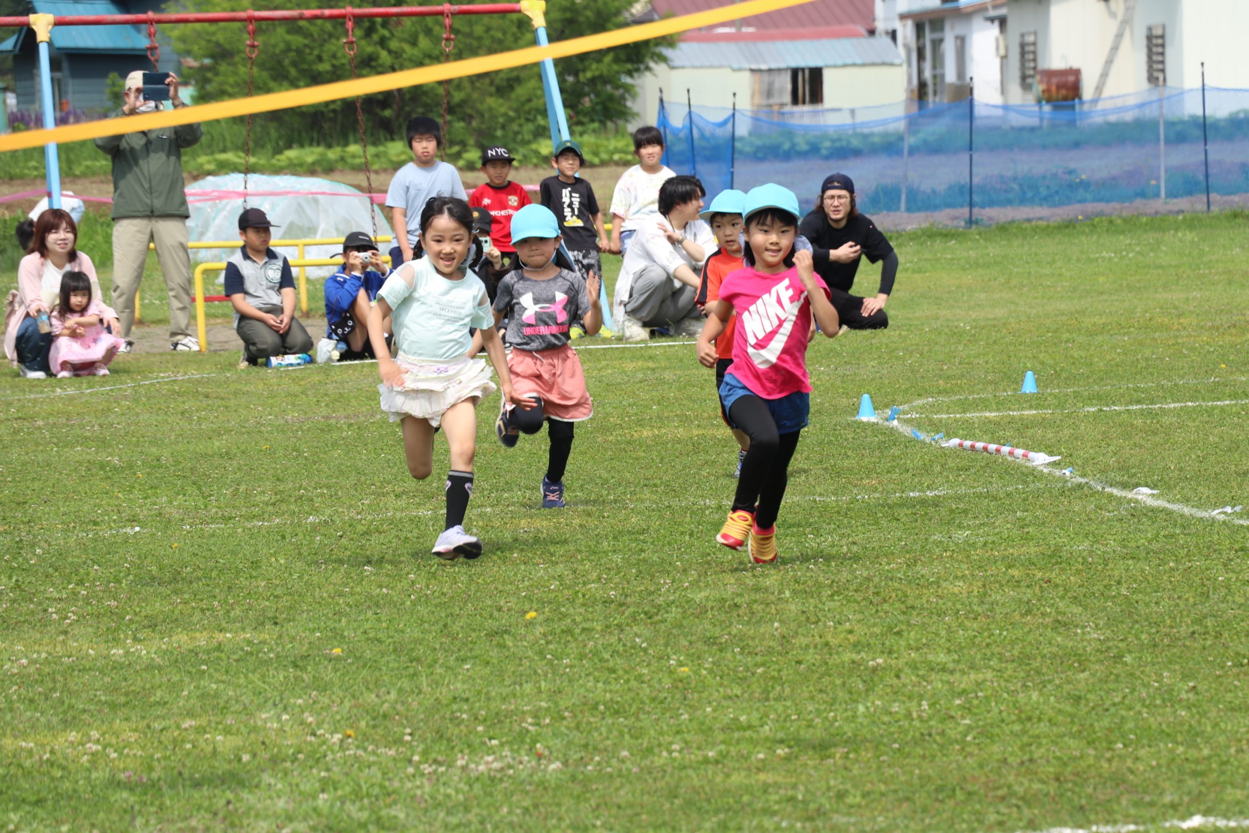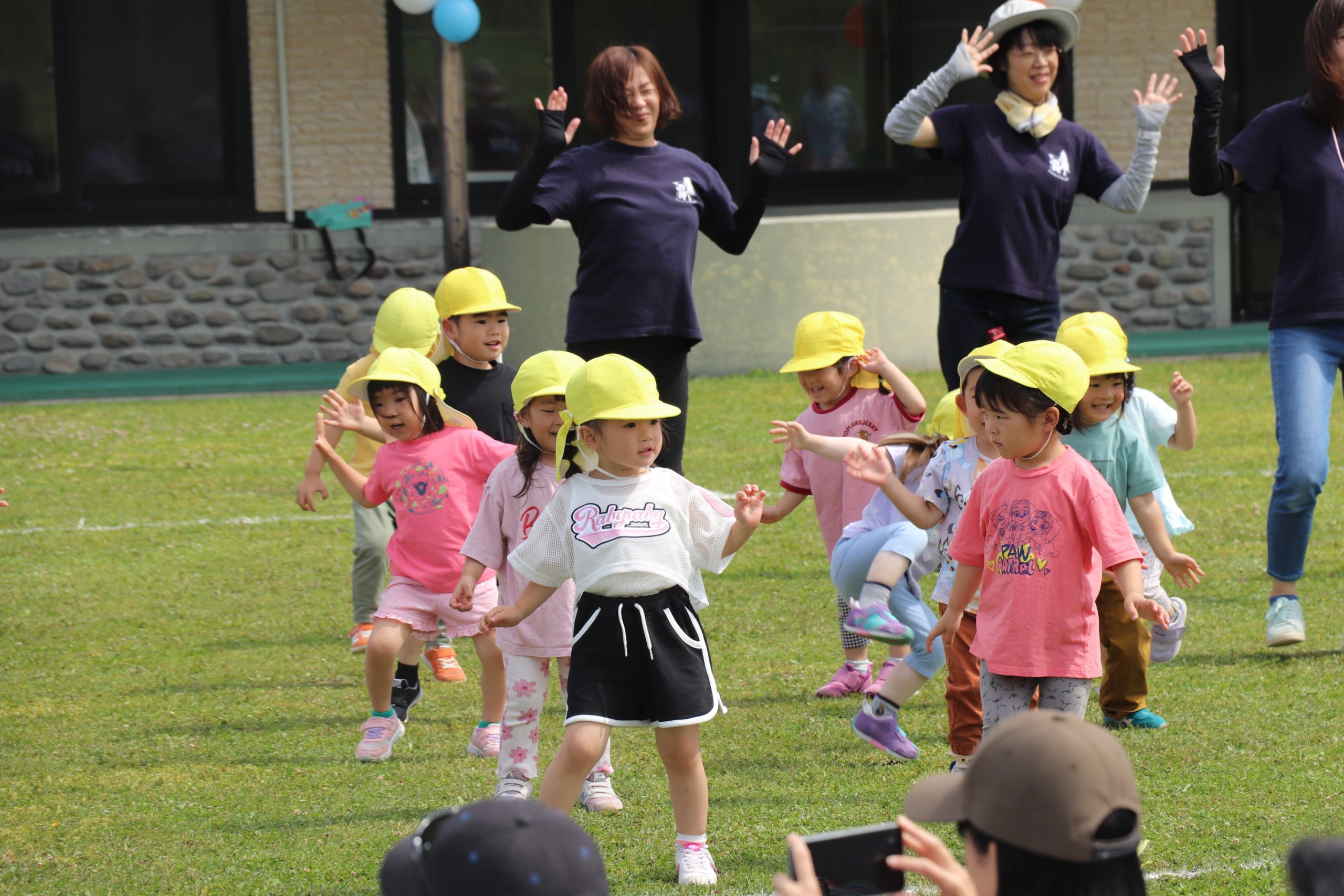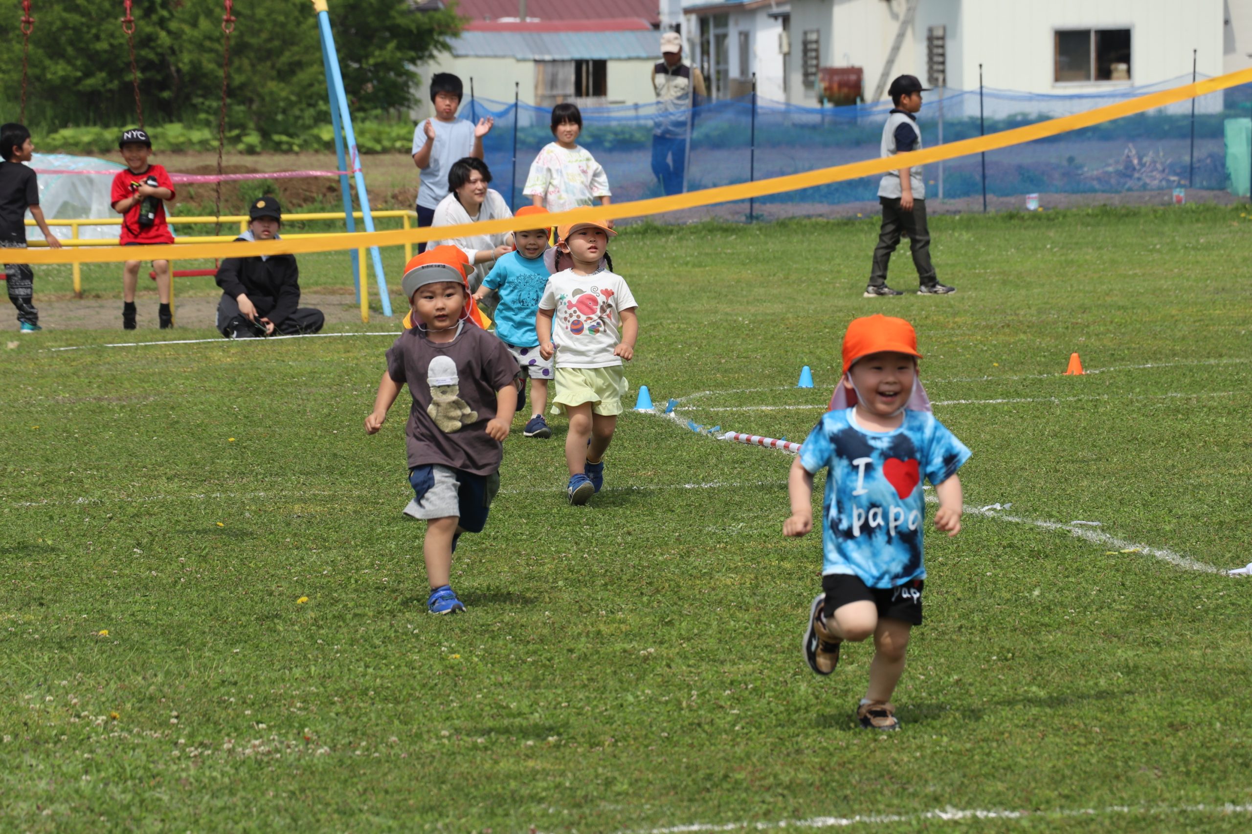 全園児による「わらってシャーッ!」の体操から始まり、5歳児から順にかけっこ(徒競走)、遊戯などを実施した。かけっこでは、スタートが早く、一度戻ってくる園児や、先生と手を繋ぎながら走る1歳児など、園児が生き生きとした表情で取り組む姿に多くの拍手が送られた。