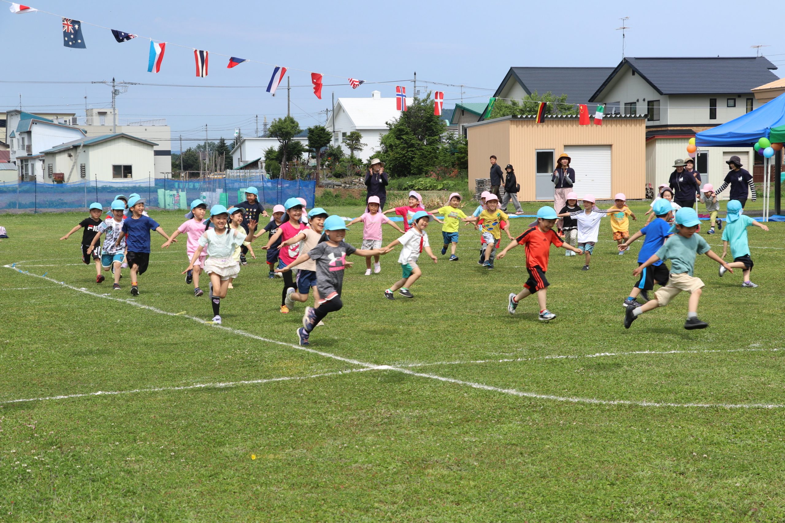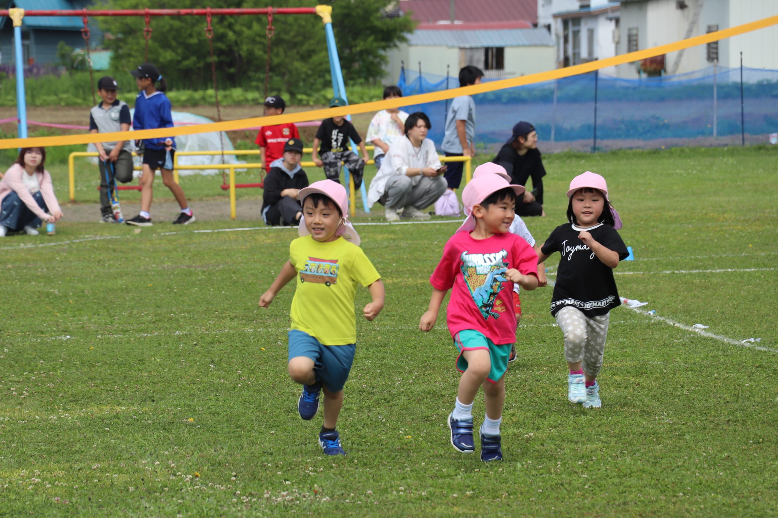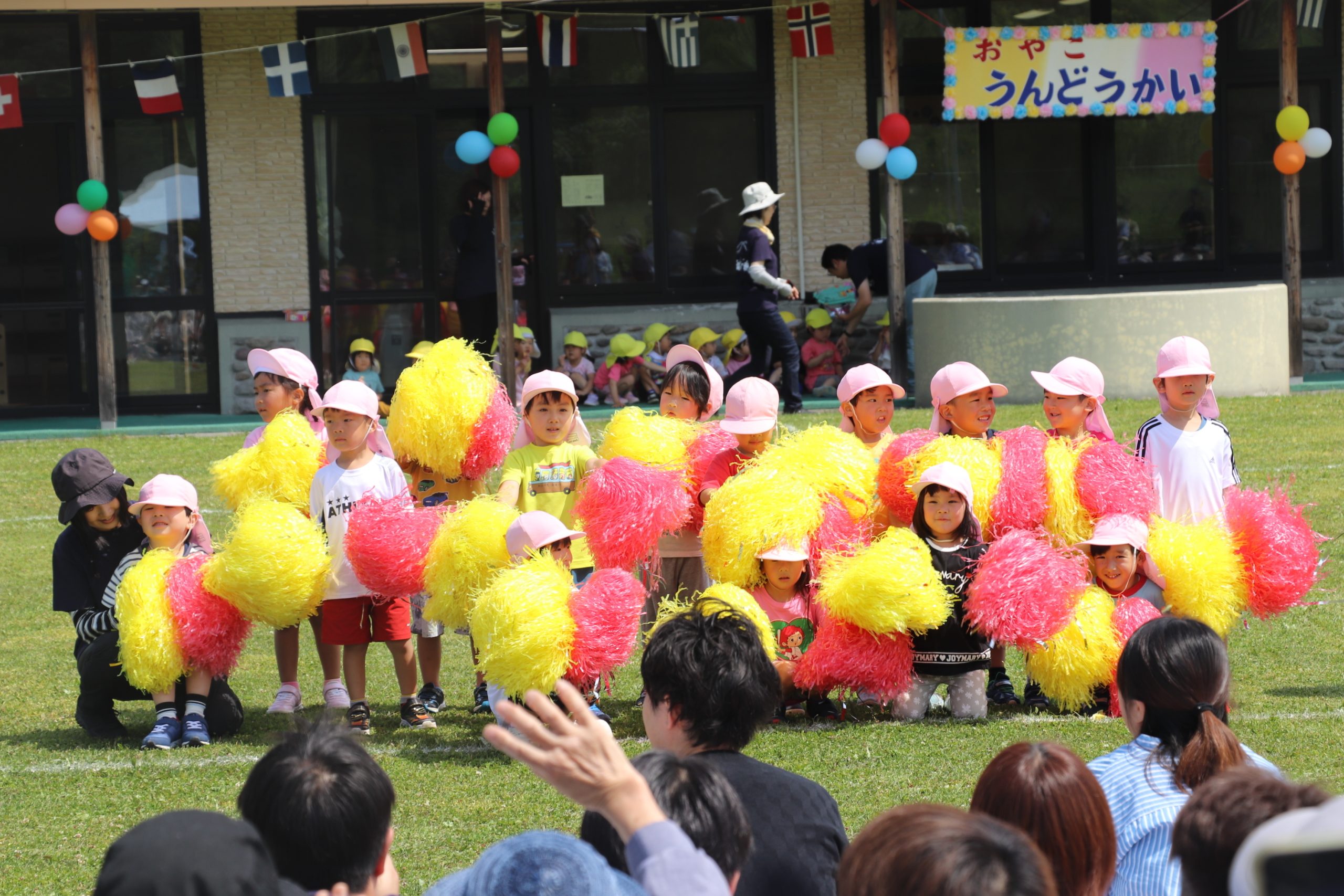 全園児による「わらってシャーッ!」の体操から始まり、5歳児から順にかけっこ(徒競走)、遊戯などを実施した。かけっこでは、スタートが早く、一度戻ってくる園児や、先生と手を繋ぎながら走る1歳児など、園児が生き生きとした表情で取り組む姿に多くの拍手が送られた。