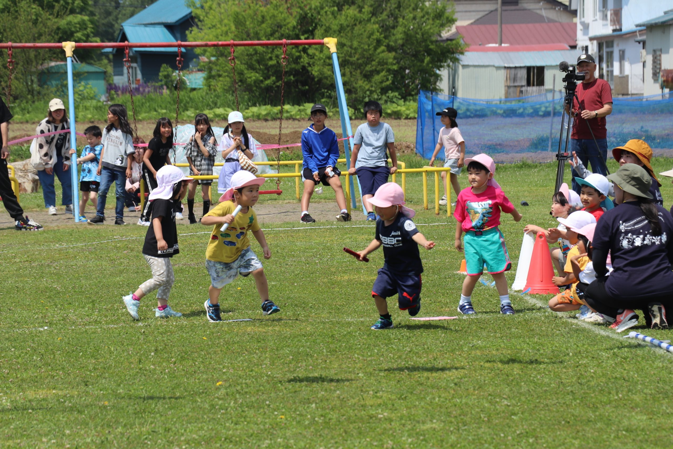 その後、4・5歳児による玉入れ、保護者種目(レンタルリレー)を行い、最後に、3歳児、4・5歳児に分けて紅白リレーを行った。