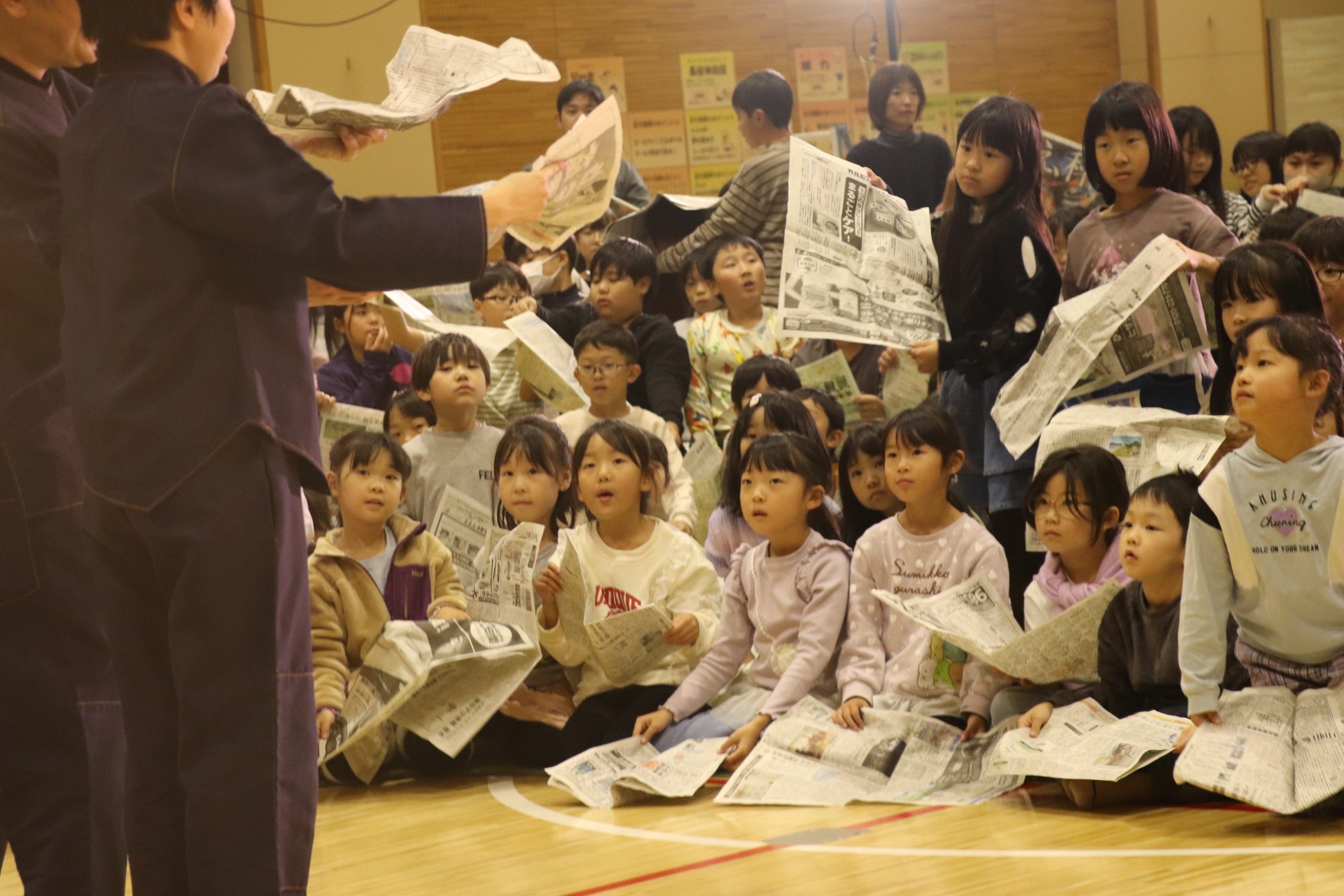 劇団員の2人は「山を越え 川を越え きたかぜのおくりもの」を上演。山を越え、川を超えてやって来た風の子の2人が、新聞紙やビニール袋を使って元気いっぱいに遊ぶ姿に、児童たちは「わー!」「おー!」などと歓声を上げながら見入り、物語へと引き込まれた。