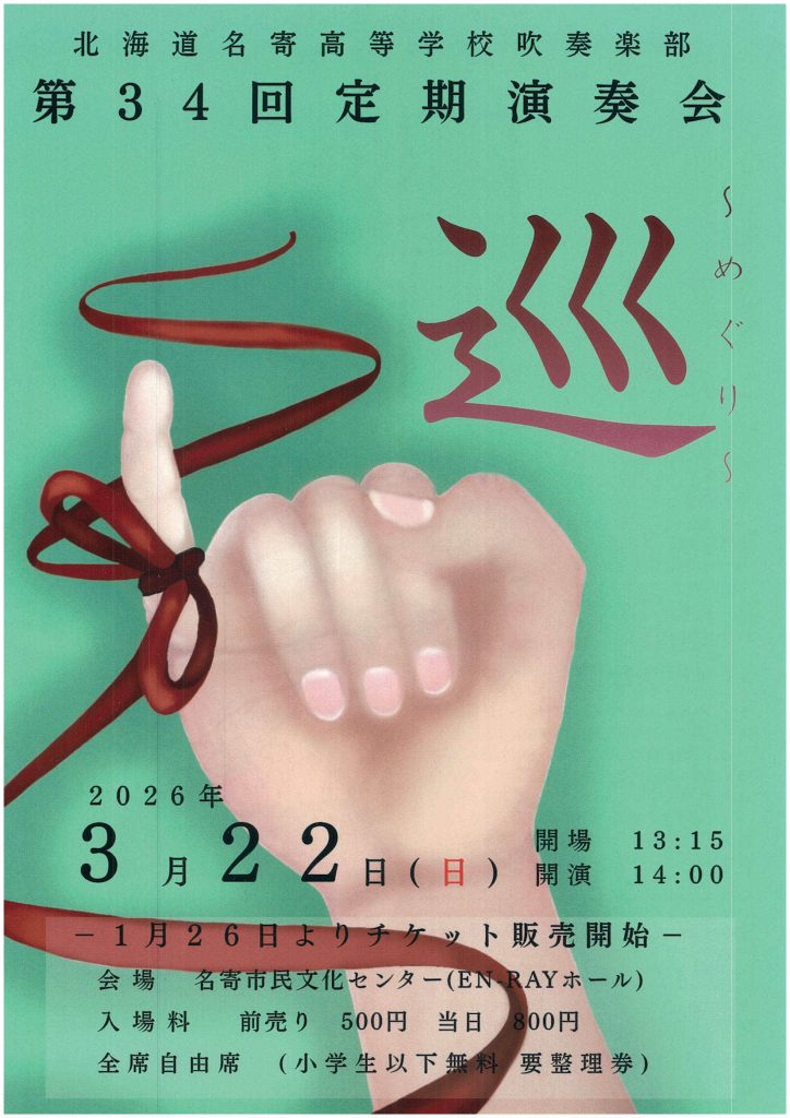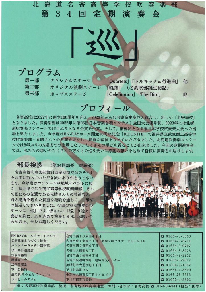 名寄高等学校吹奏楽部による定期演奏会。ぜひ足をお運びください。