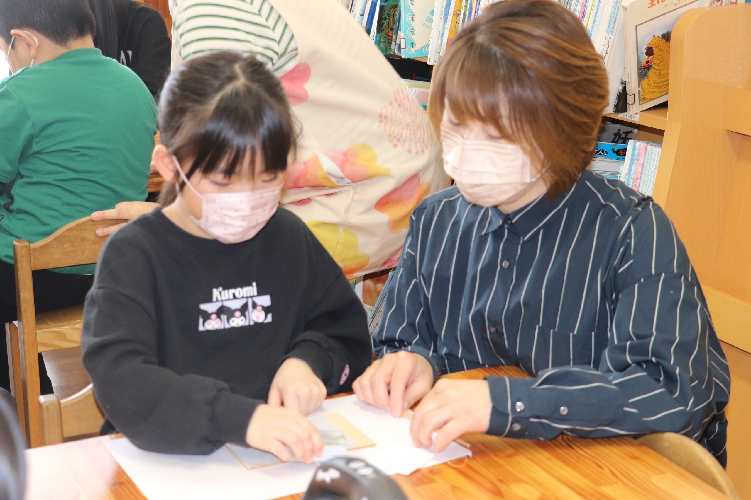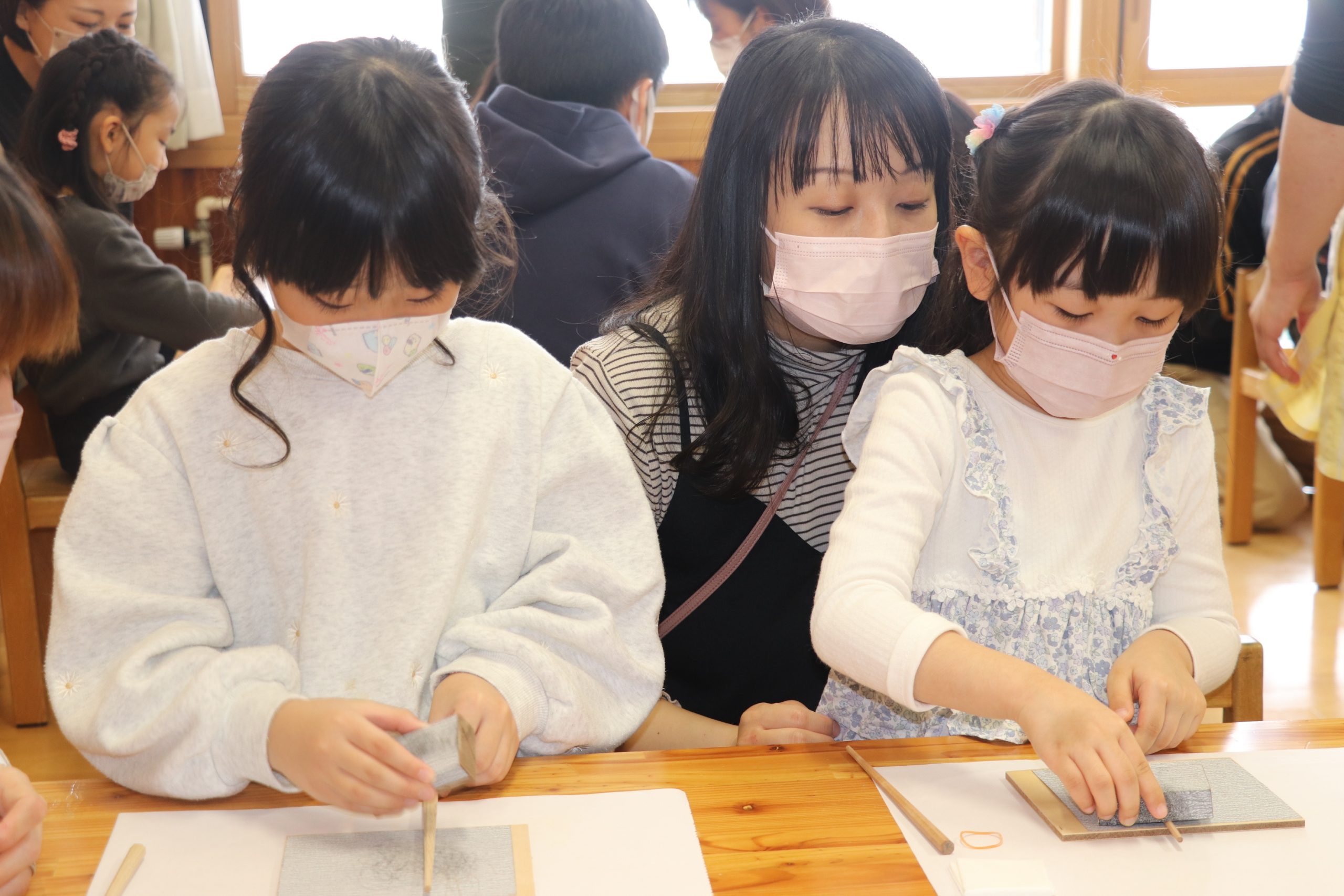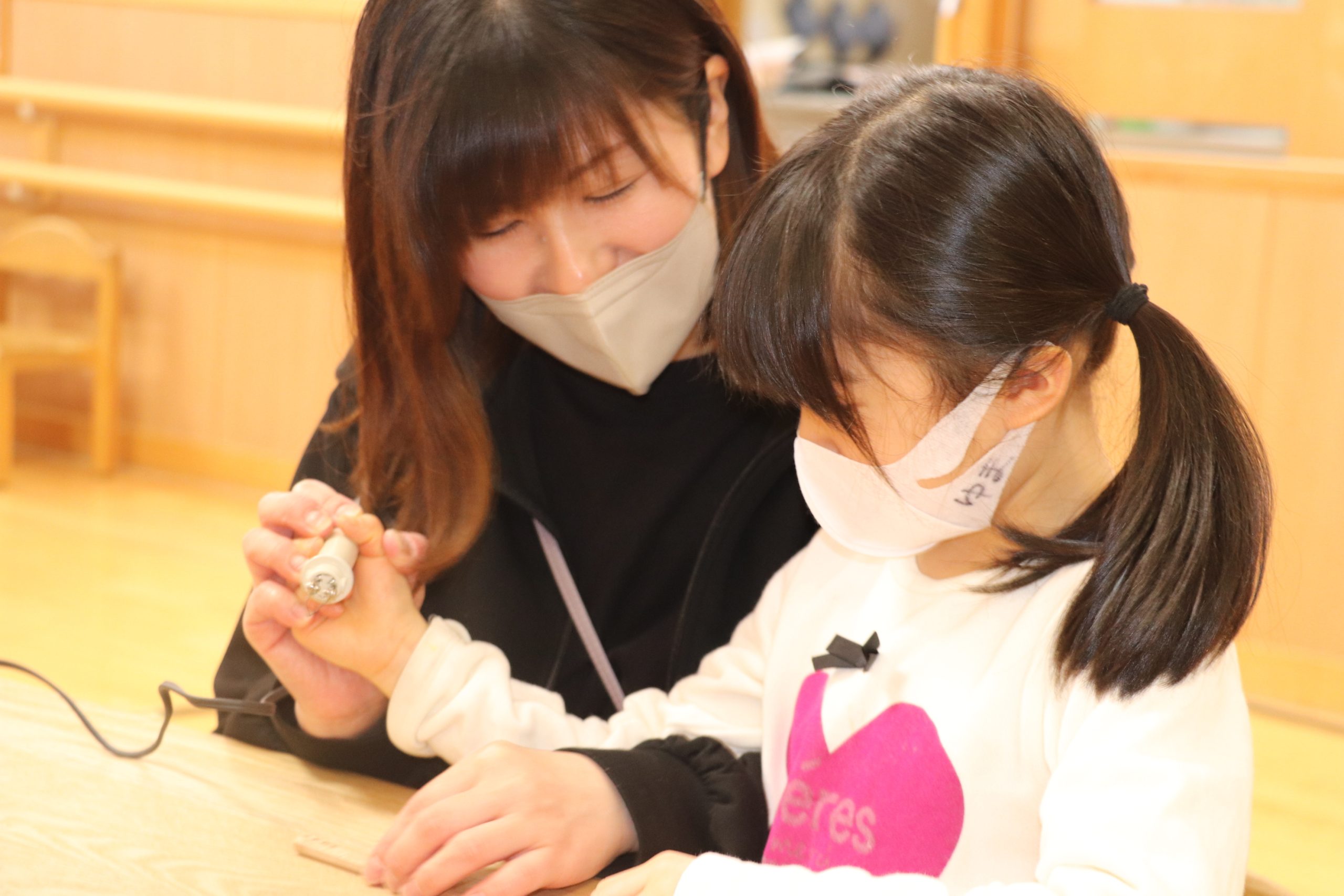 園児たちは、自分の箸を選び、ザラザラしている部分にサンドペーパーをかけて削り、その後、バーニングペンを用いて箸と箸置きに自分の名前を書き込んだ。