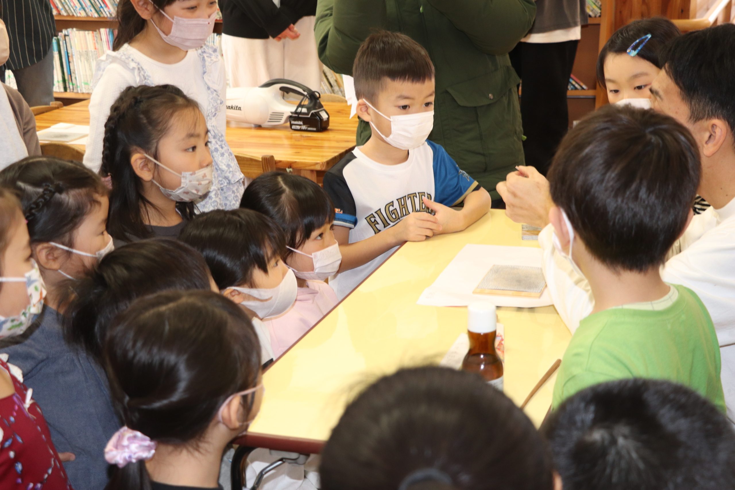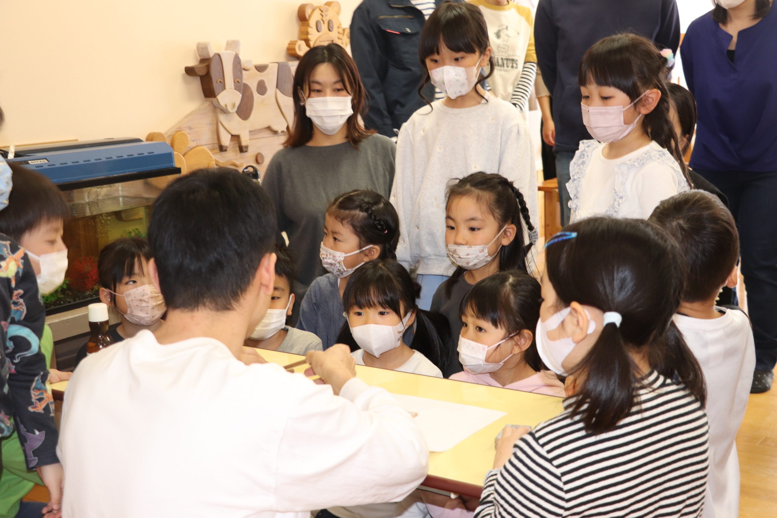 始めに大石さんが、園児や保護者を集めて、箸の素材や作り方などを説明。