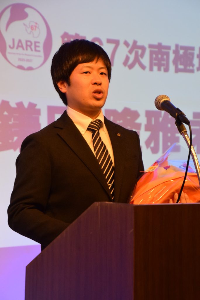 小中高校の同級生で稚内消防署に勤務する川村元太さん(34)家族から花束を受け、鎌田さんが壇上で「市職員では15年ぶり3人目の観測隊員だが、社会情勢が複雑化・多様化する昨今、柔軟に対応できる力が必要になる。事務職として専門的な任務に当たる隊員のサポートに努めたい。帰ってきた際に子ども達に魅力を伝えられるようにしたい」と決意。川野忠司副市長の万歳三唱で鎌田さんの背中を押した。