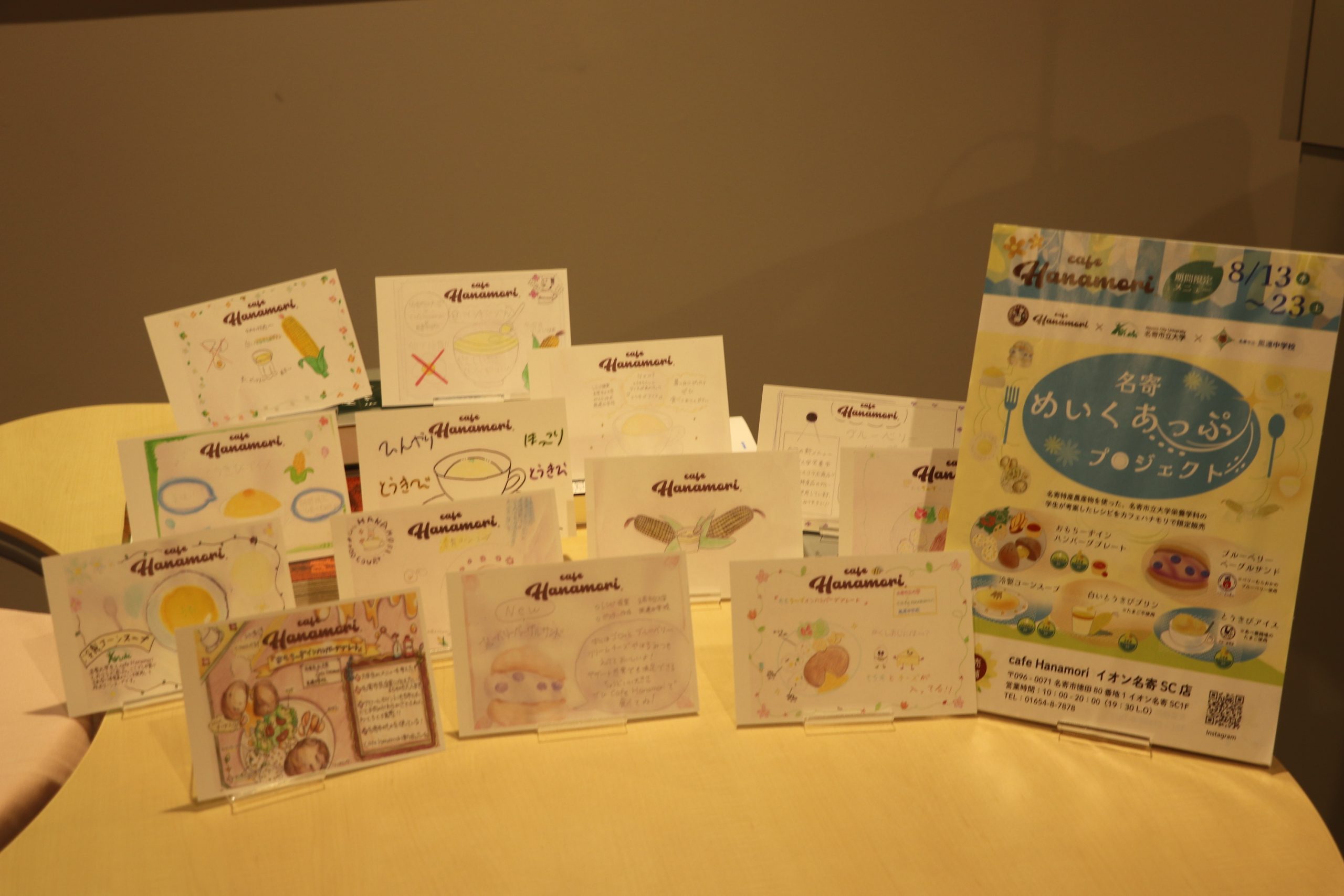 同大学栄養学科の学生は、地域農産物を使ったレシピを考案。cafe Hanamoriは、試作に使うもち米、トウモロコシの提供と、考案レシピの商品化及び販売。風連中学校は、イラストレーターのかわいえみさんの協力を得て、PR用のポスターを制作した。
