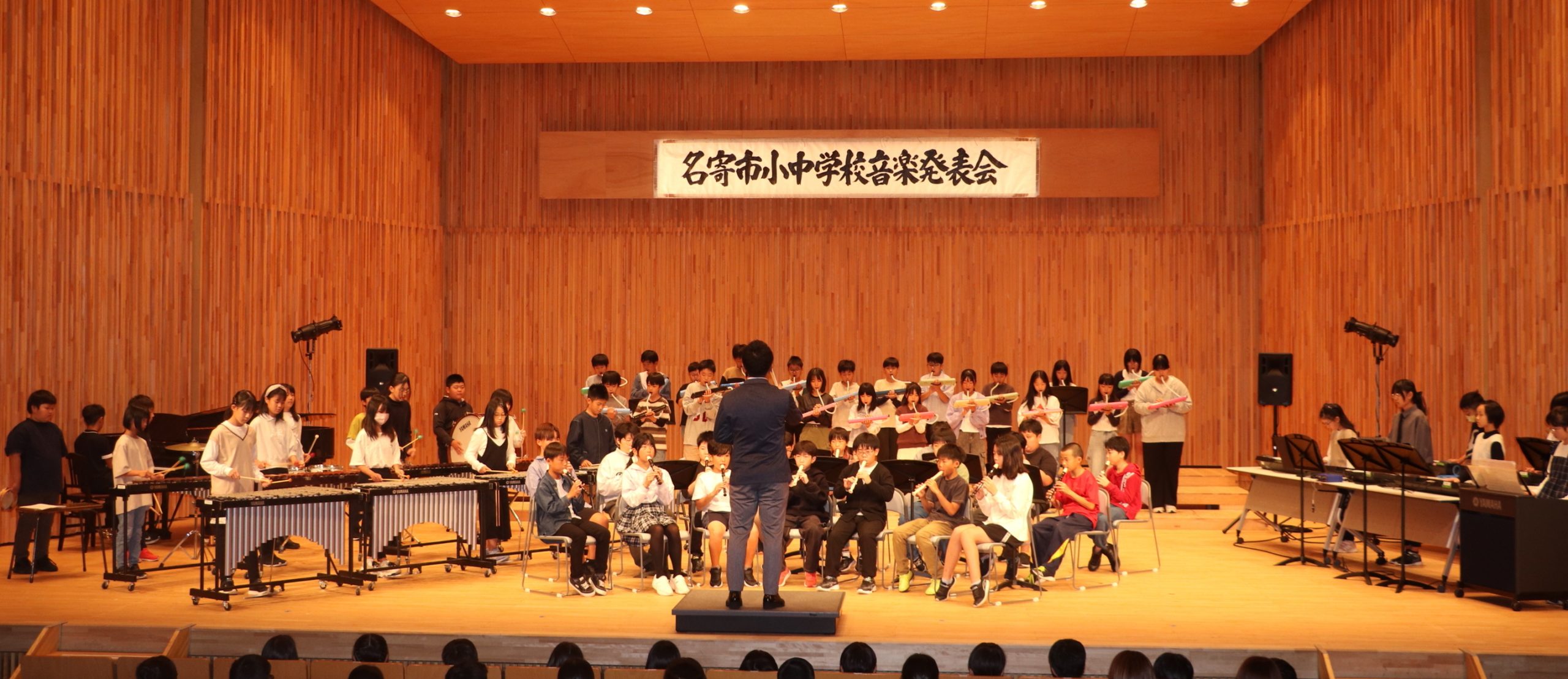 第1部は最初に名寄南小学校の5年生(66人)が器楽「ジブリメドレー」を演奏。参加小中学校の中で最も人数が多く、素晴らしい音色を会場いっぱいに響かせていた。